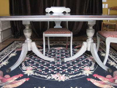 Antique table, double pedestal with brass footings. Solid wood with 4 matching chairs. Finish is an antique gray with distressing and glaze.