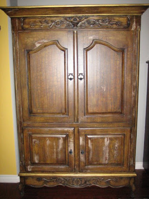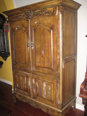 Stunning large armoire. Solid wood with unique detailed carvings. Has pocket doors and swivel tray so you can angle the t.v. Storage underneath.