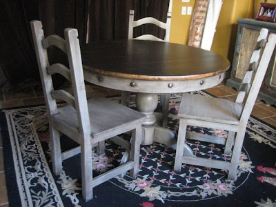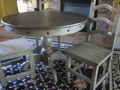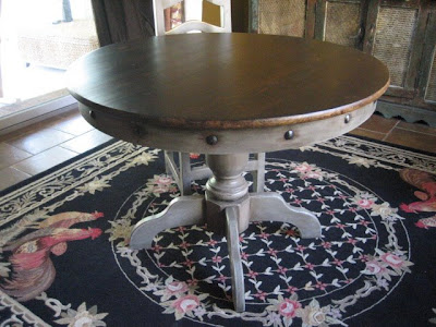 Round 42"pedastal table with nail heads and 3 chairs. Pine wood. Gray distressed finish and stained top. Great size for smaller kitchen or apartment!