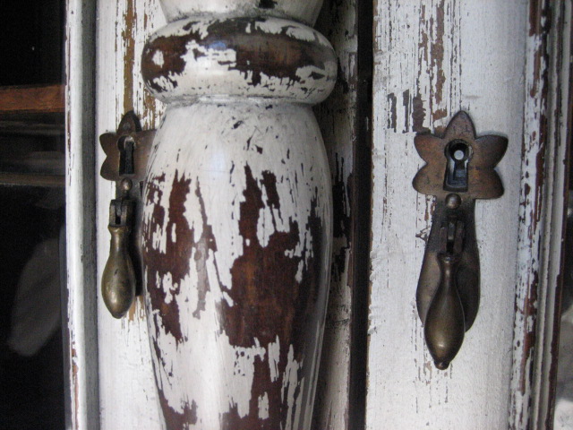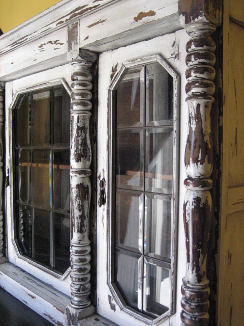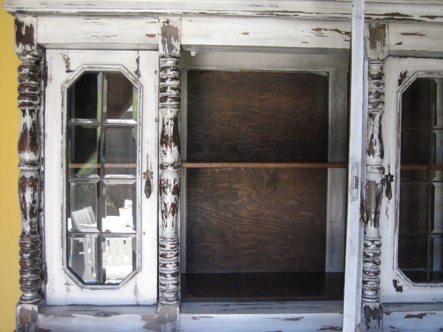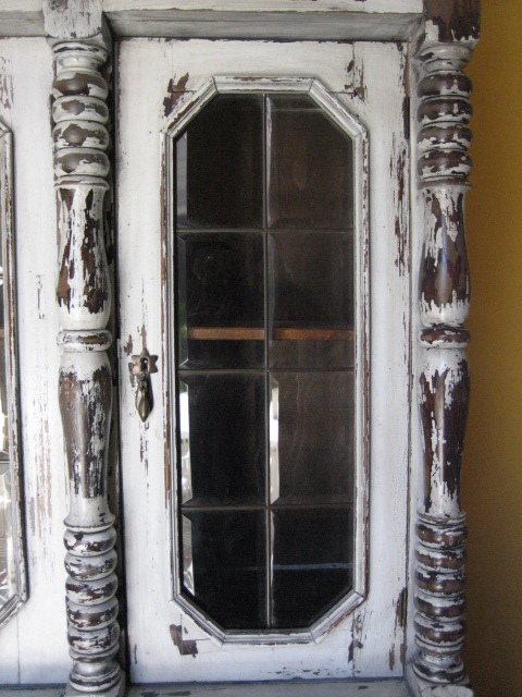 Amazing antique Belgian hutch. Antiqued white finish. Original hardware and keyholes. Leaded beveled glass cabinets.