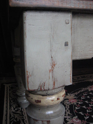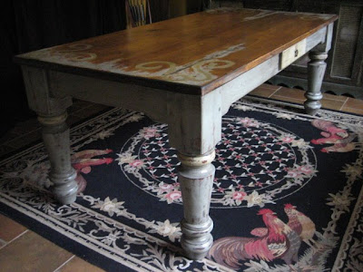 Very large, solid wood dining table. Antique gray finish with a tad of glazed yellow in just the right places. Beautiful stained top with hand-painted scroll work.