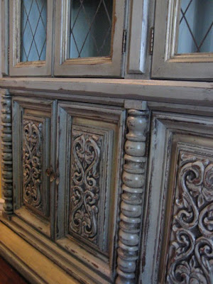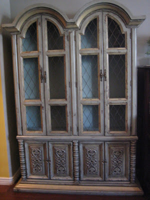 Antique gray finish with brown trim along molding and cabinets. Slightly distress with glaze. Double arched with unique carving details on lower cabinets. Thick metal crisscross wire on upper cabinets.