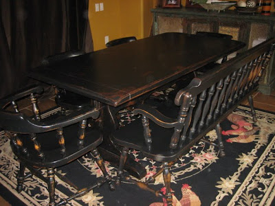 Rustic Ethan Allen farmhouse table with large bench and 4 chairs. Black finish with distressing.