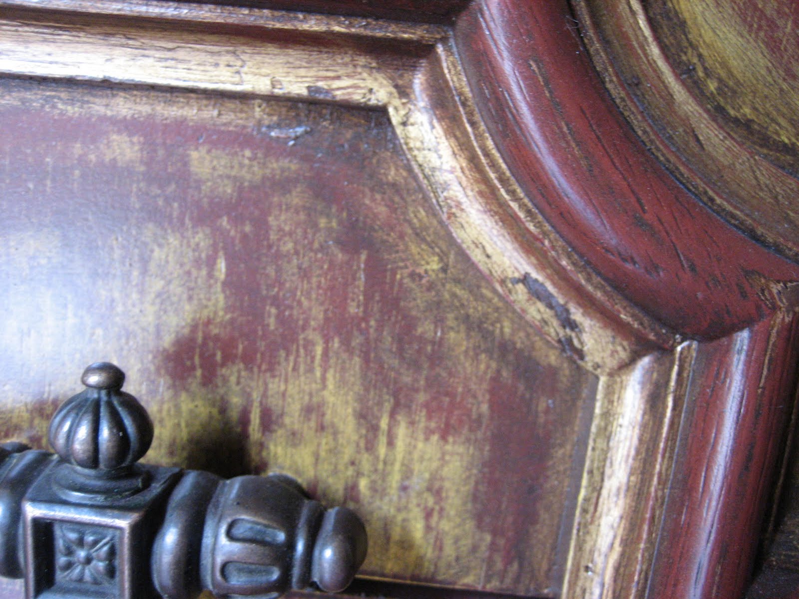 Wonderful rustic pulls. Red and yellow with gold accented trim distressed. Smooth black top and base.