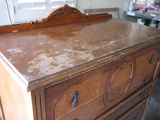 Shabby french at it's best. A subtle sage green that will change to a gray or light brown depending on time of day and sunlight. Very intricate. Very detailed. Original pulls with glass knobs. Five drawers. Solid wood. On caster's. LOVE IT!