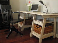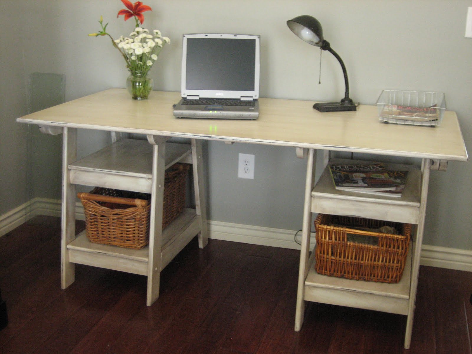 Sawhorse trestle desk or use as a craft table. Cream finish with light distressing. Open shelving. Push up against wall or center in room. Both sides are identical.