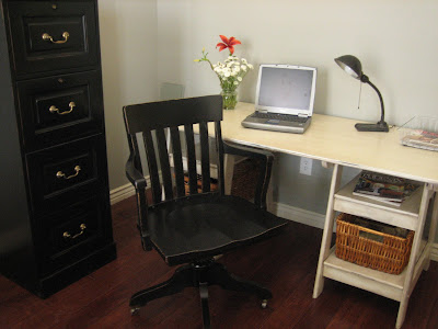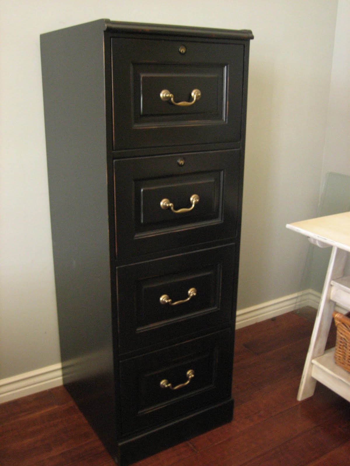 Four drawer file cabinet, two top drawers have lock and key. Raised panels. Black finish, light distressing.