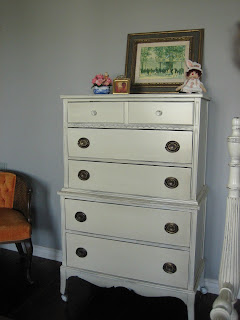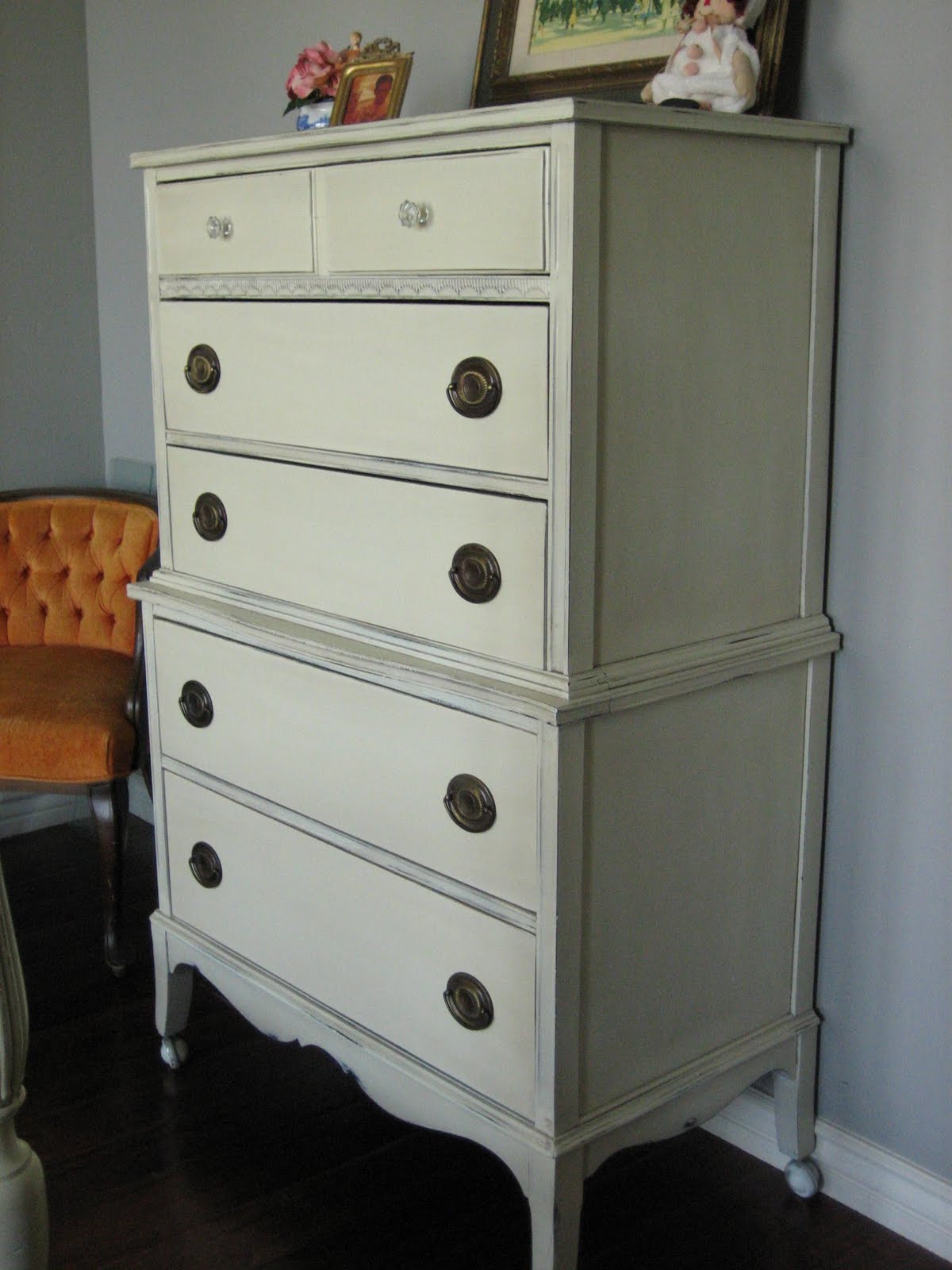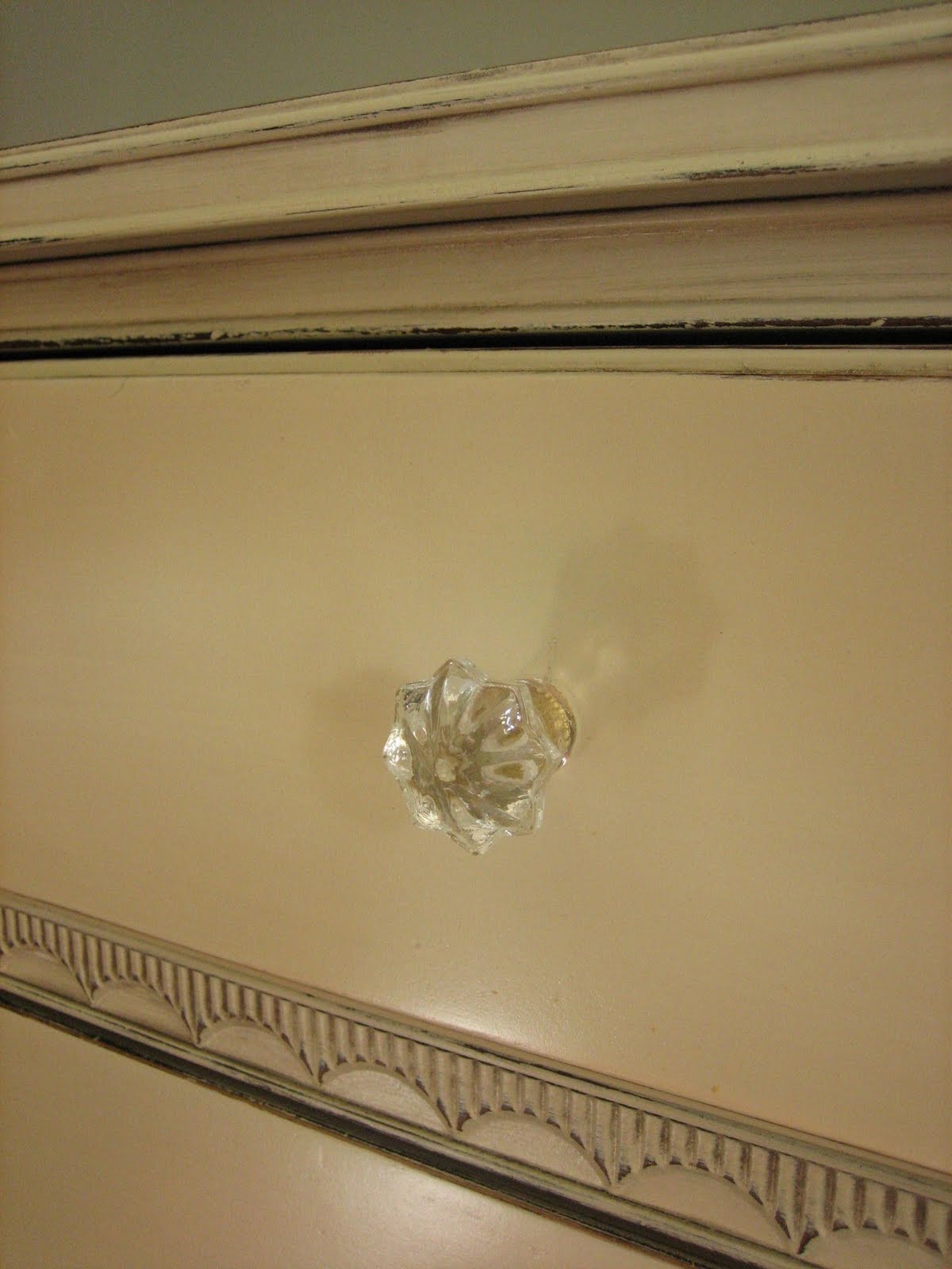 5 drawers. upper drawer has glass knobs. bottom drawers have original hardware.