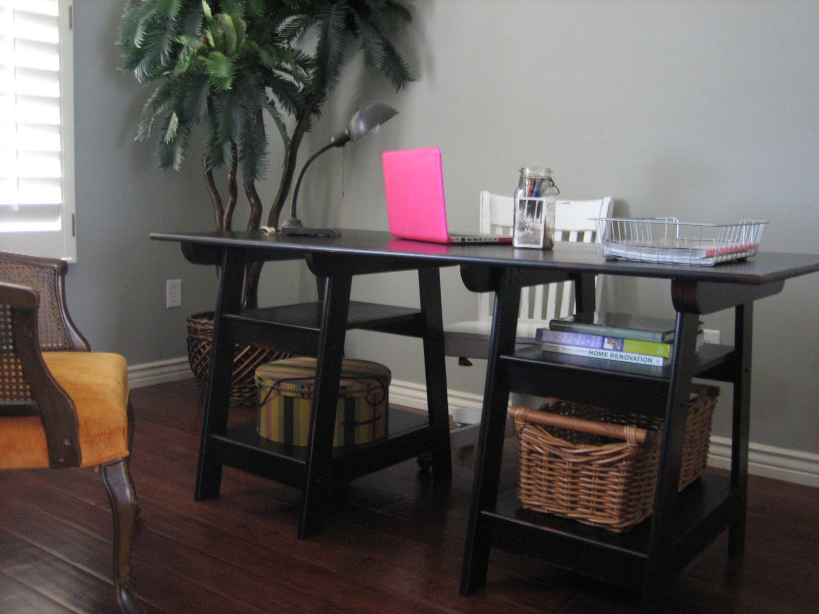 Nice large trestle/sawhorse desk with open shelves. Solid hardwood. Black finish and rub though distress. Push desk up against wall OR would be really cute centerd in room, both sides are identical. Use as a desk OR use as a craft/scrapbook table.