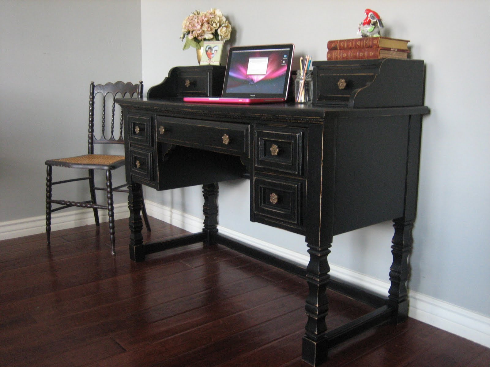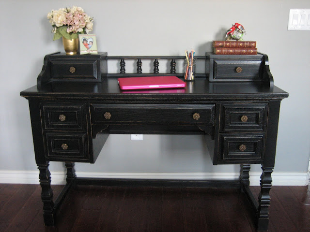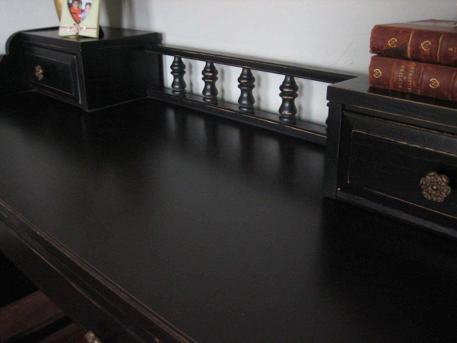 Charming desk in black finish very lightly distressed. Seven drawers total. Love the legs and spindled backing.