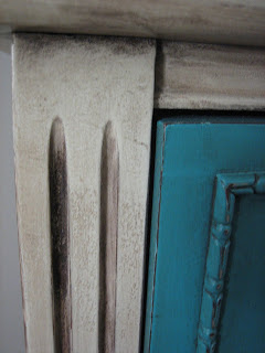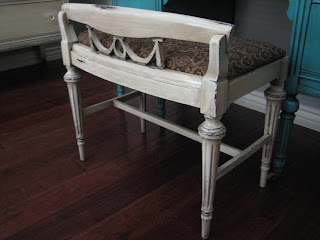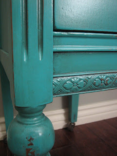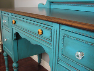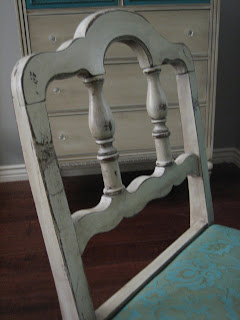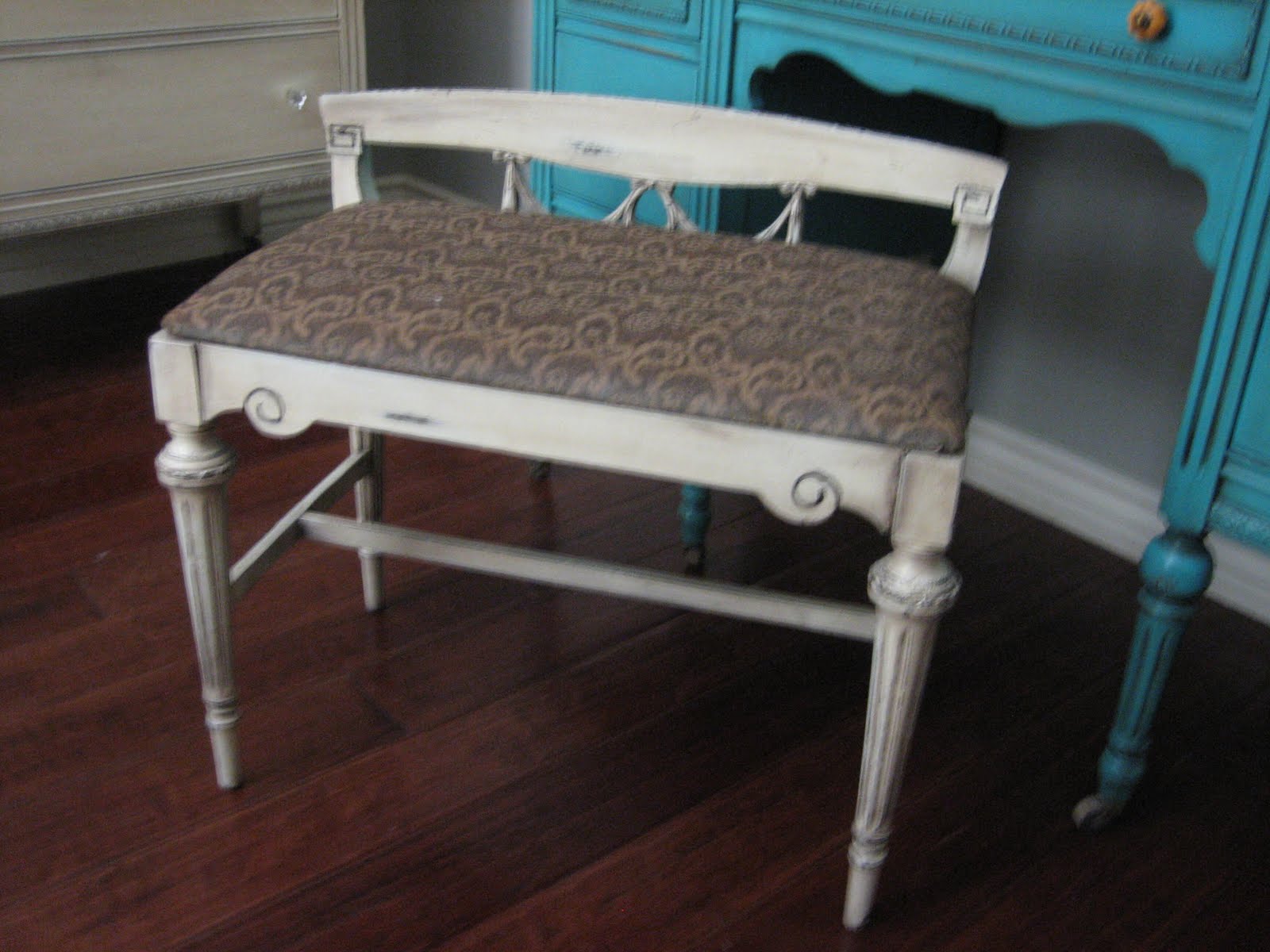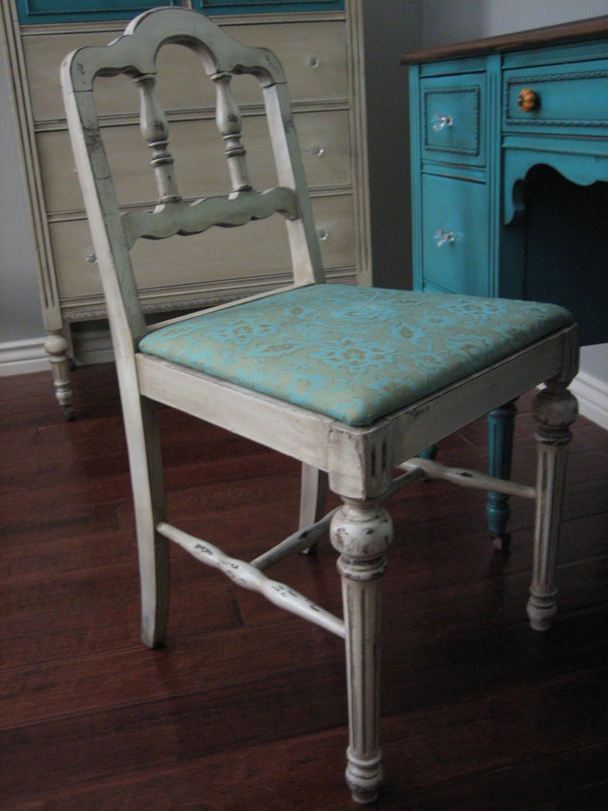 Full size wood antique bedroom set. Colors are a smooth cream and a striking turquoise teal. Complete matching set with intricate details mimicked on each piece. Vanity and dresser stand on wooden casters and have charming decorative glass and ceramic knobs. Darling desk chair and vanity bench seat. Fabric could easily be swapped out for something more to your liking.