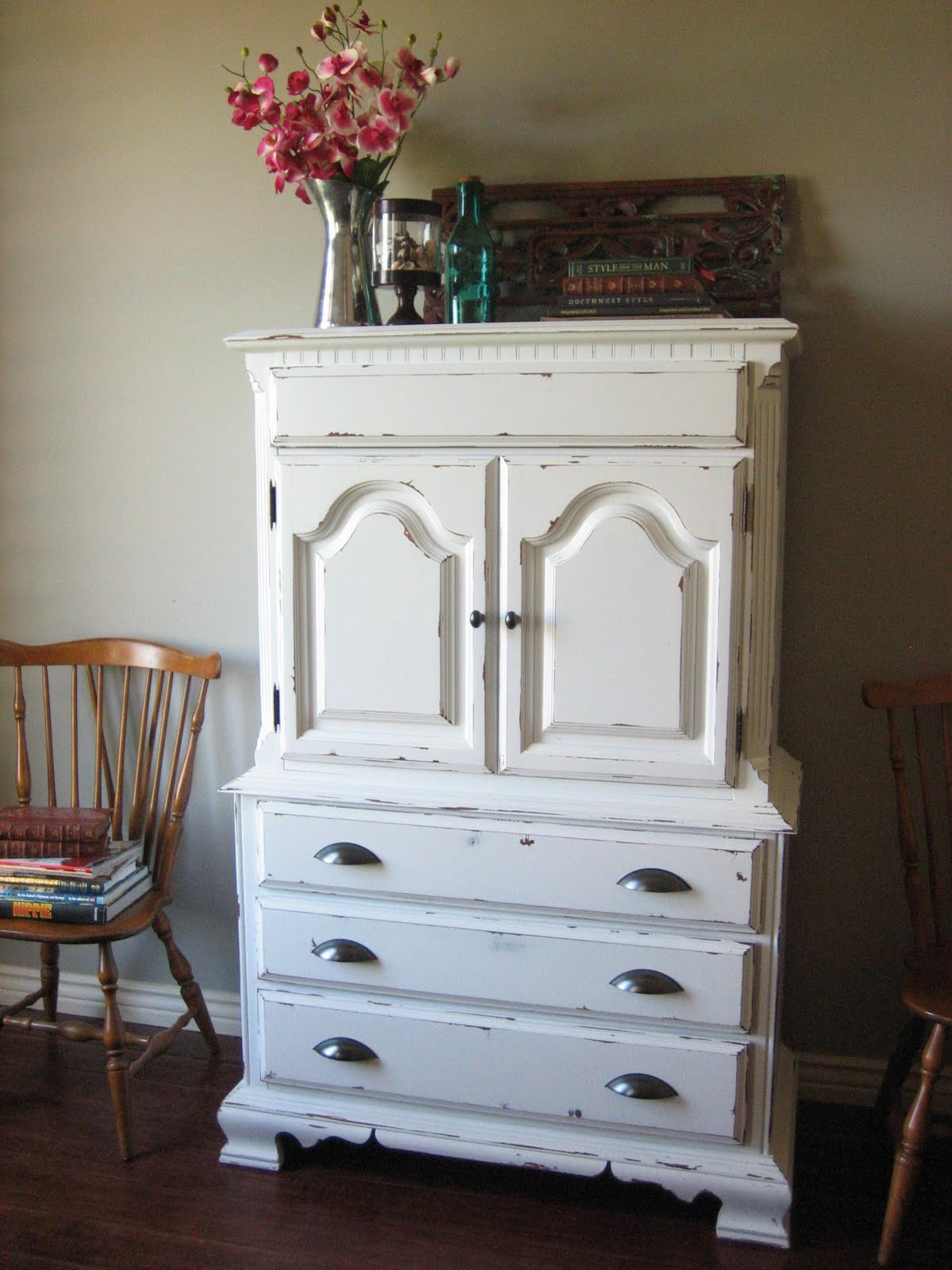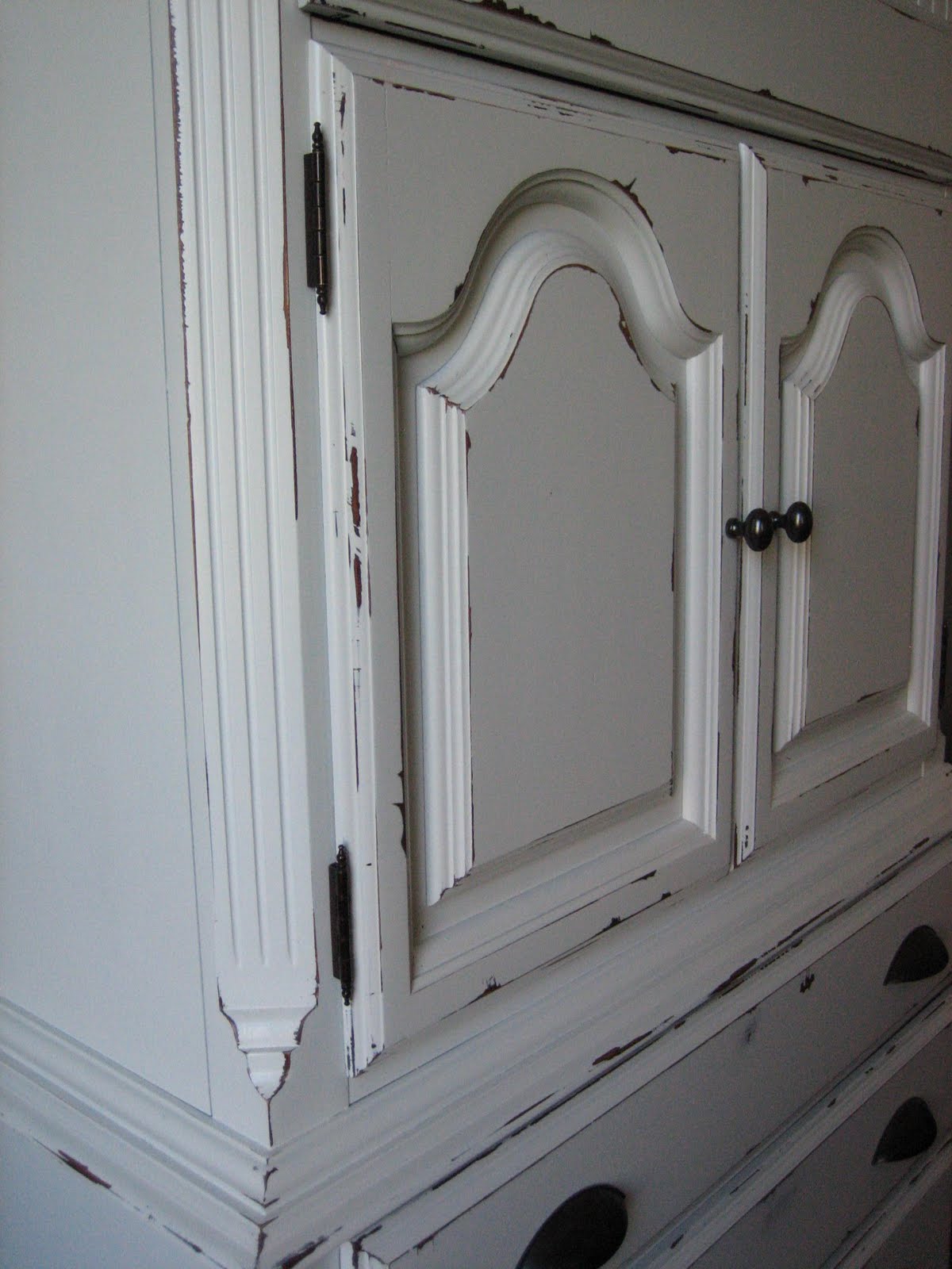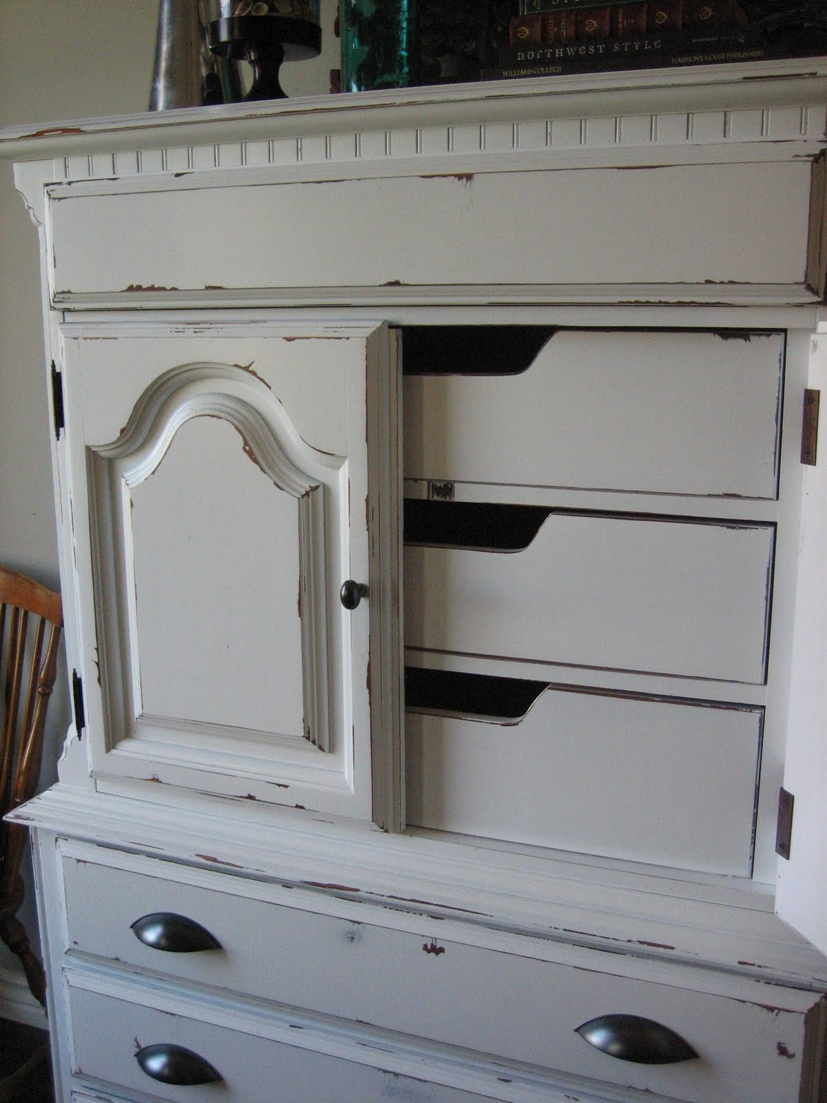 Large chest of drawers. Smooth crisp white with a chippy distress. Oil rubbed bronze pulls and knobs on cabinets. Three drawers on bottom, three behind cabinets PLUS the panel above is a drawer for a total of SEVEN drawers...lots of great storage.