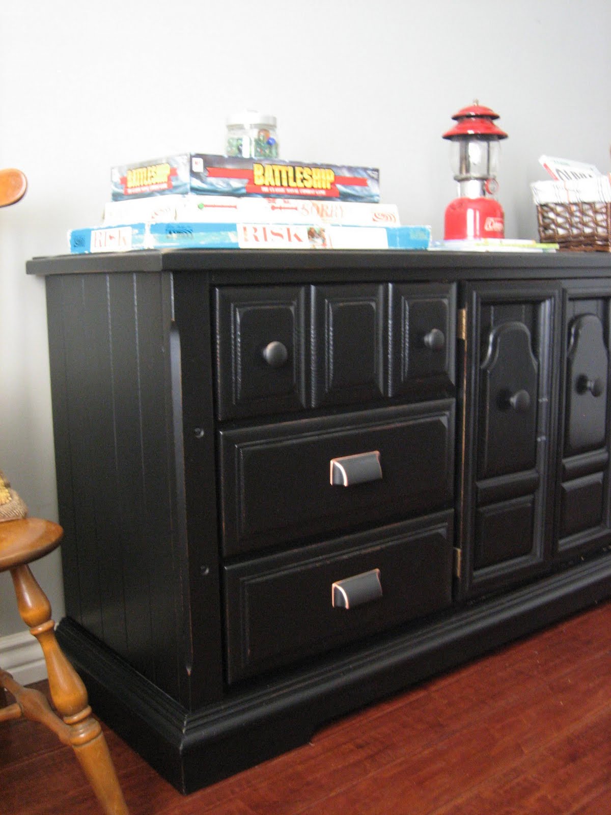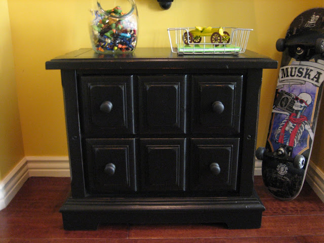 Great wooden bedroom set in smooth black. Very lightly distressed. Cool oil rubbed bronze bin pulls and chunky knobs. I have TWO identical nightstands, long dresser and a tall dresser. Will look great in a boys/girls bedroom, toy room OR adults room.