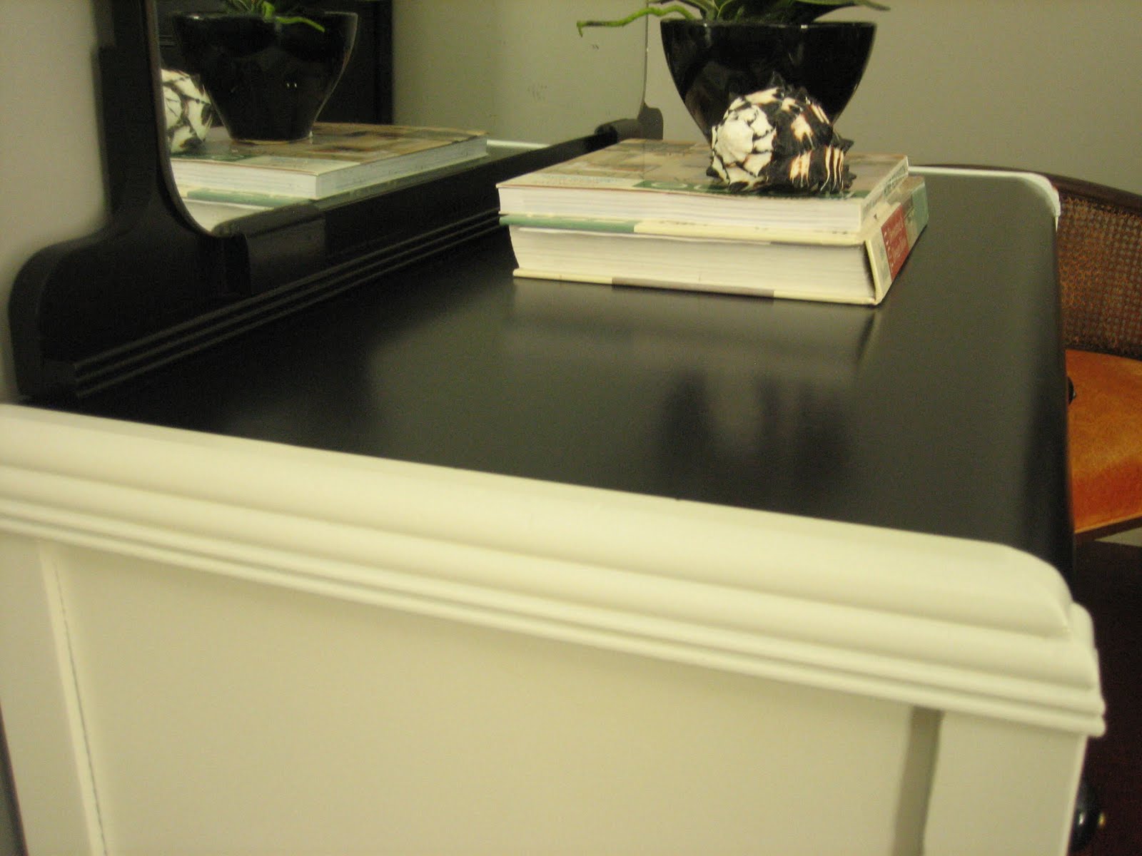 Mid-century vintage 1940's wood waterfall dresser with mirror. Black and ivory white with black ceramic decorative knobs.