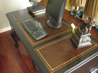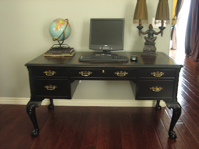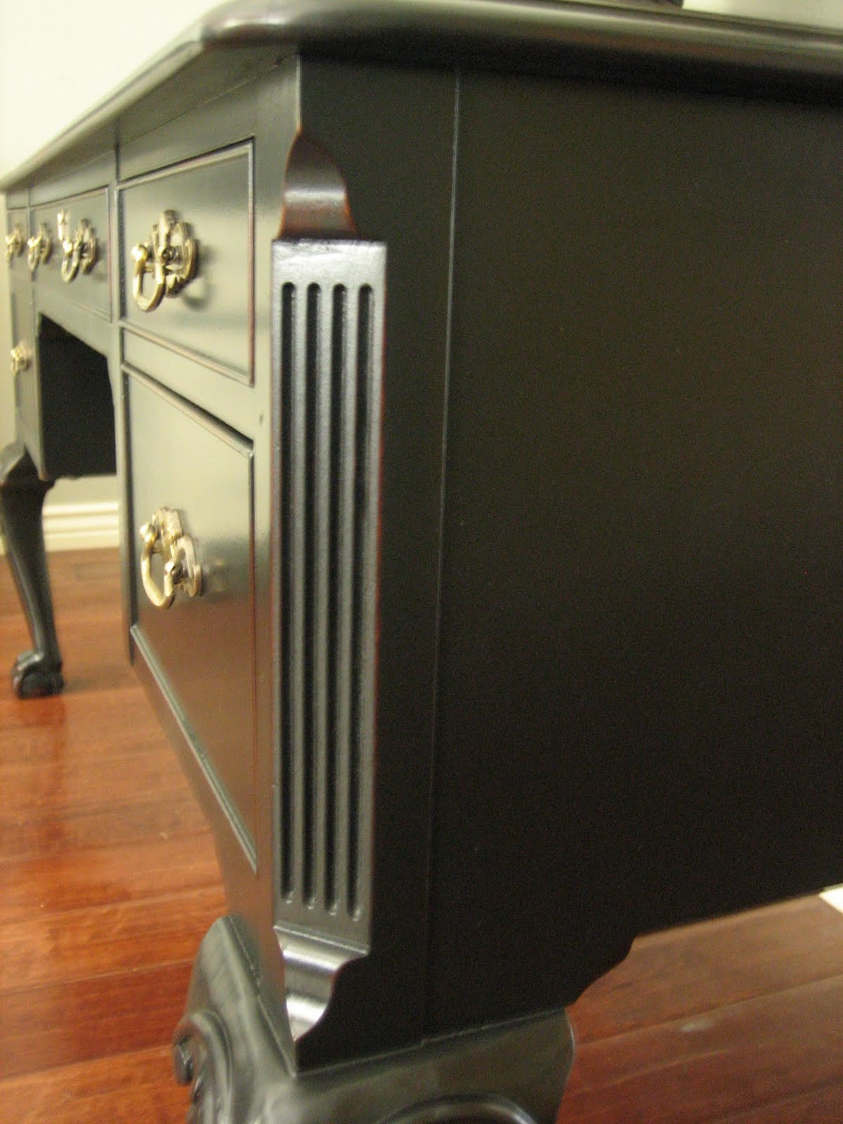 Large quality home/office executive desk. Black rub through distress finish. Carved cabriolet leg with claw on ball foot. Fluted chamfered corners. Dark brown leather top with gold leaf design. Four drawers, one of which is a deep file drawer on metal slides. Push up against wall or center in room - back is finished. A very pretty, elegant desk.
