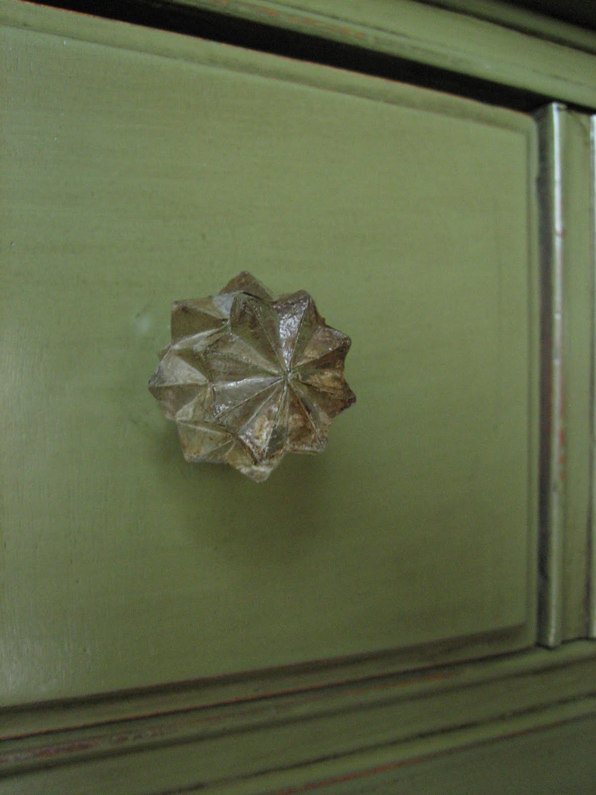 Lovely dresser in a dark olive/army/camouflage green with a glaze. Pretty dark stained top. Very faint distressing. Decorative glass cut knobs. Five drawers total.