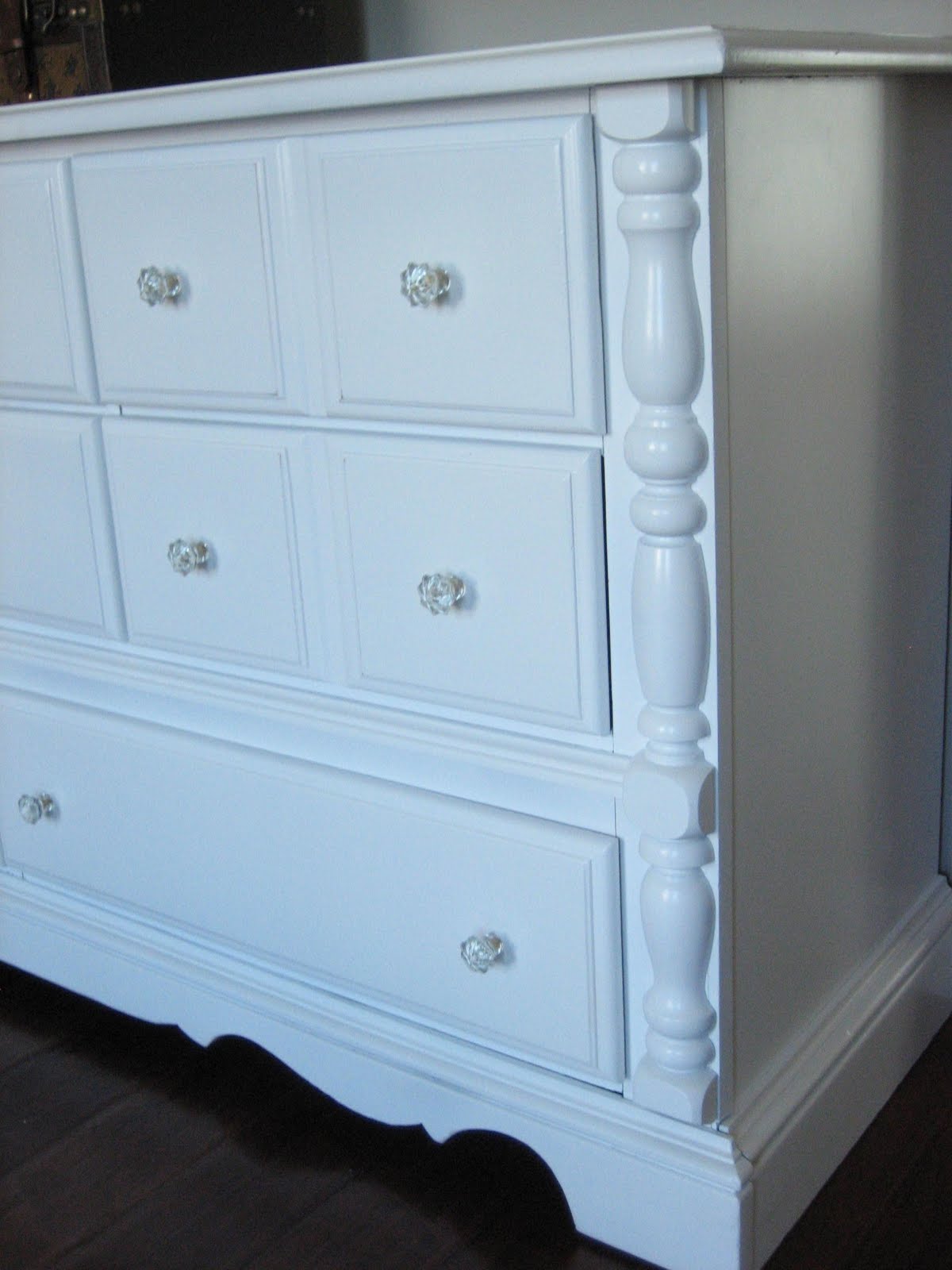 Two dressers in a smooth crisp white. Pretty decorative glass cut knobs. Tall dresser has a total of 5 drawers. Wide dresser has 9 smaller drawers on top and 2 large drawers on bottom for a total of 11 drawers. ** one the drawers is missing a track.