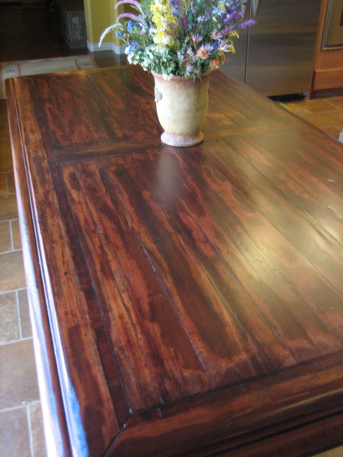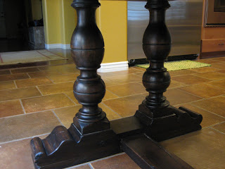High end rustic trestle dining table. Solid woods. Thick top has a variety of beautiful rustic distressed stains in browns and reds. Base is a rich dark brown with generously turned double pedestals on either side of trestle base. Hand carved knotches and rustic woods make this perfect for the old world, european, spanish colonial or rustic farmhouse - french chateau feel.