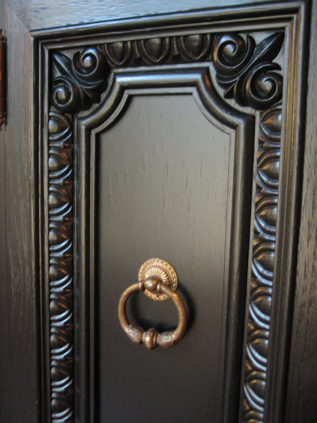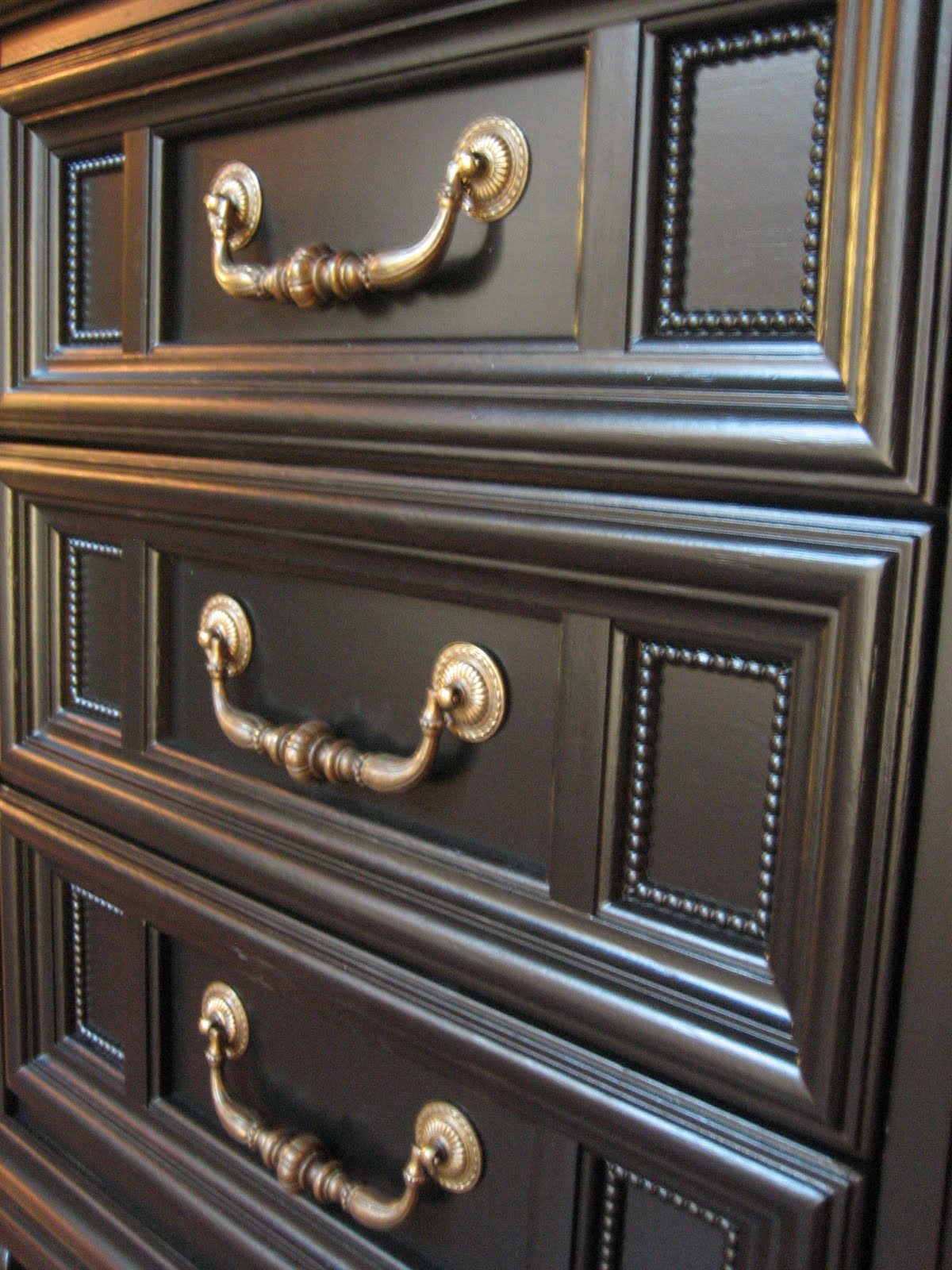Beautiful sleek black wood dresser with intricate carving details. Has 9 dove-tailed drawers, 3 of which are behind the two middle cabinets. Pretty, ornate hardware.