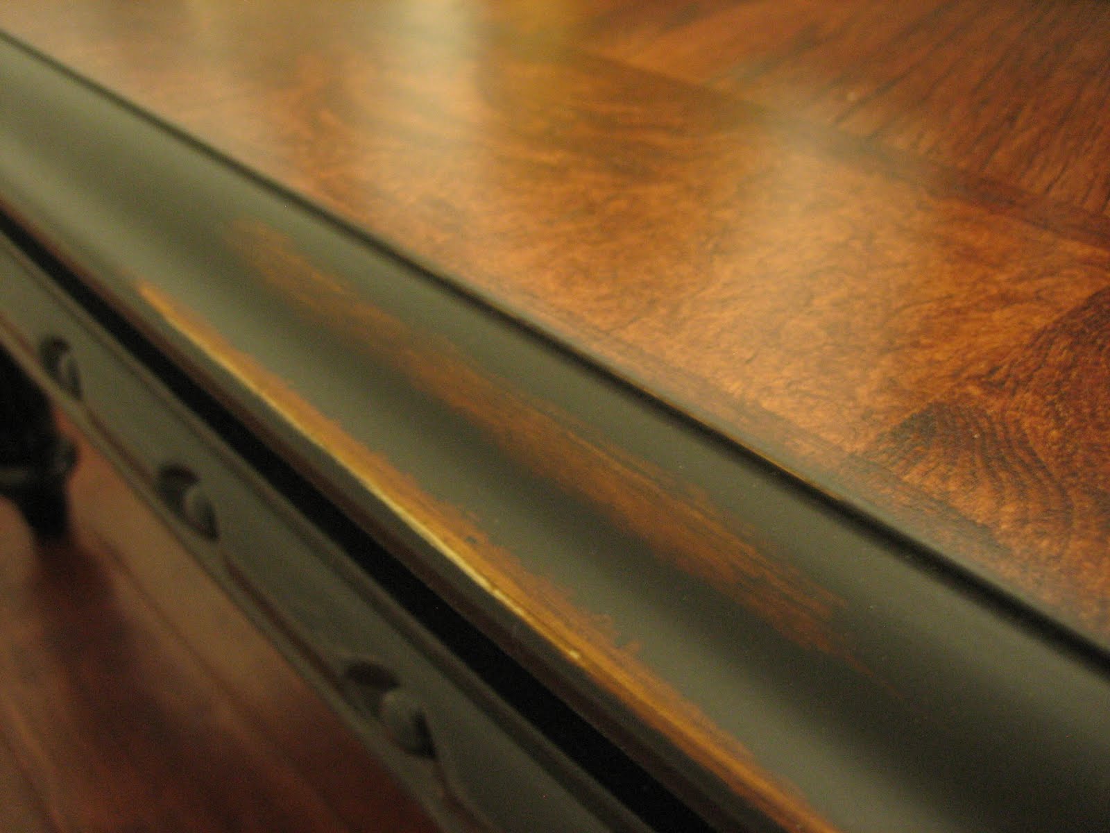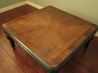 Rustic square coffee table. Black rub through distress finish with brown stained top. Chunky spindled legs. Pretty details. Solid wood.