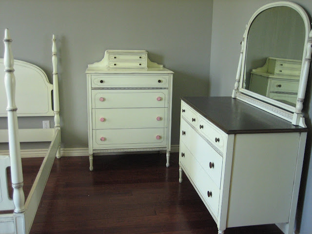 Wide dresser's top is dark brown stain. Cute wooden inlay brown knobs on wide dresser and top of tall dresser. Tall dresser also has pink knobs which could easily be painted a different color for a boy's room.