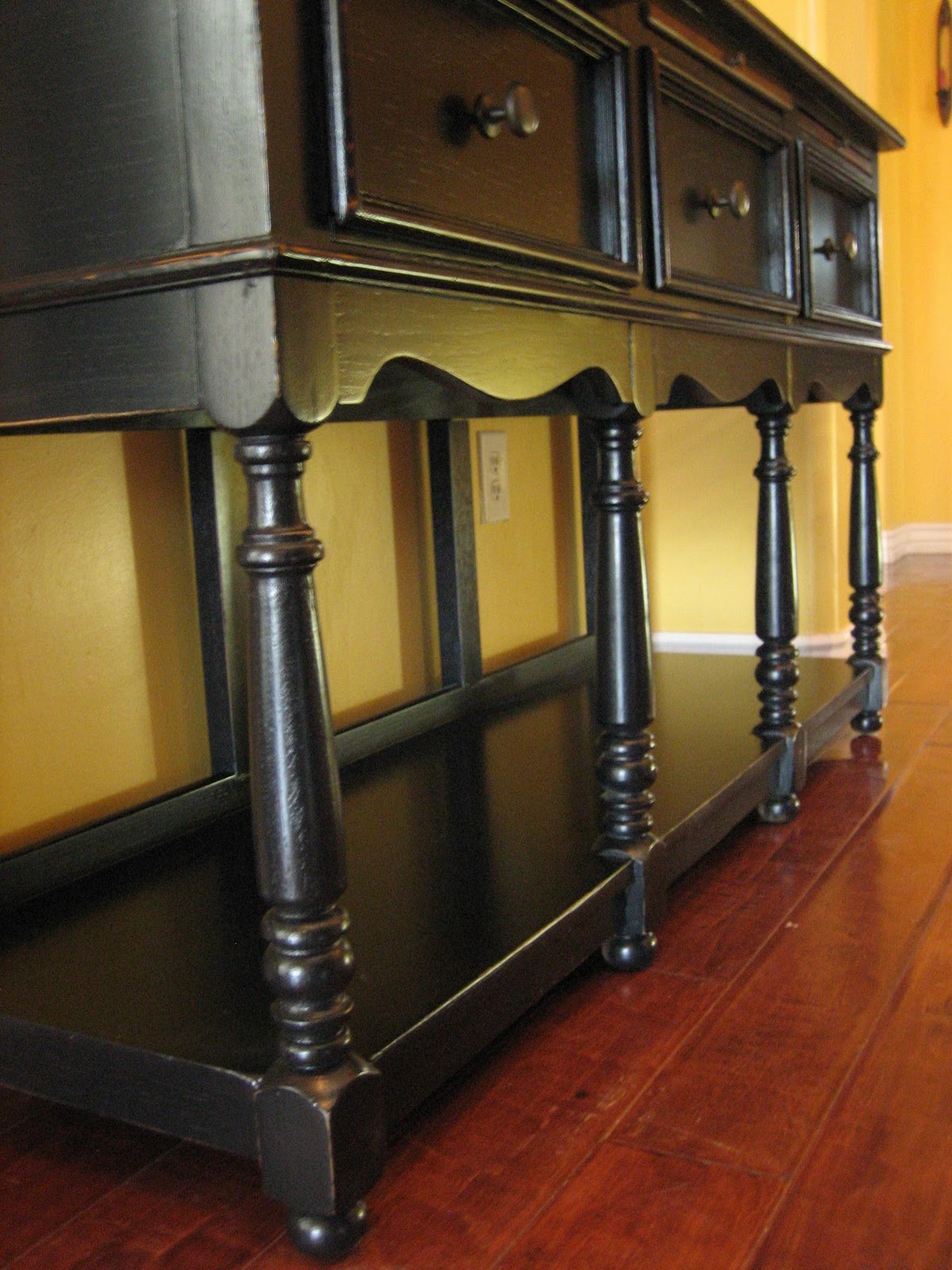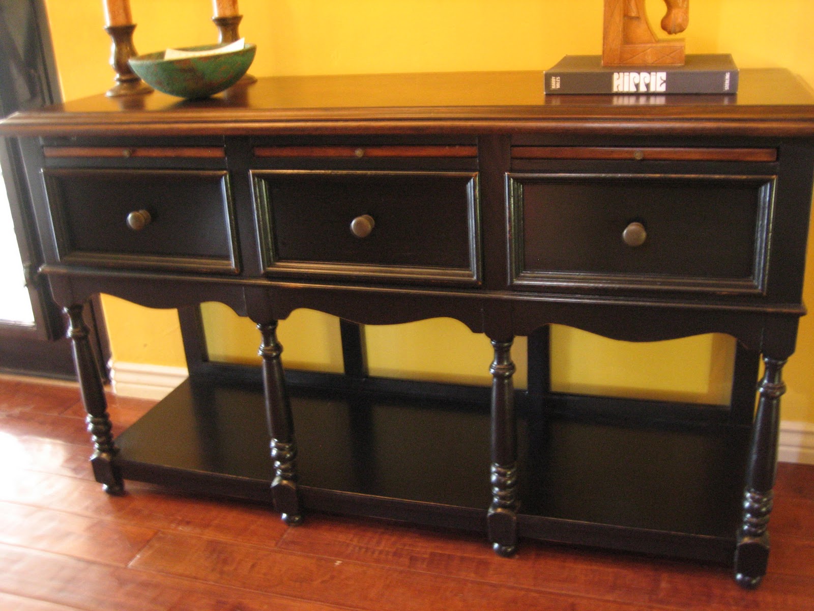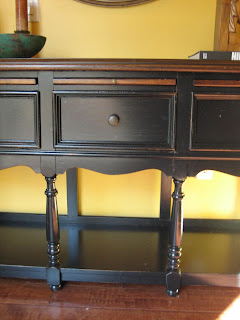 | Three raised panel drawers with a brown stained slide out tray above each. Use to serve food or a writing table. |