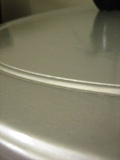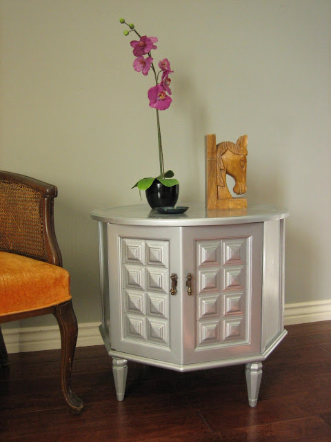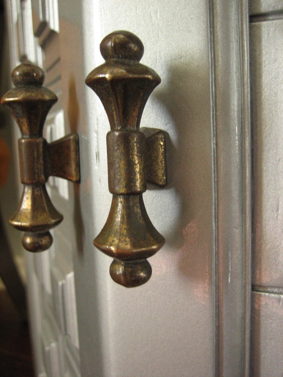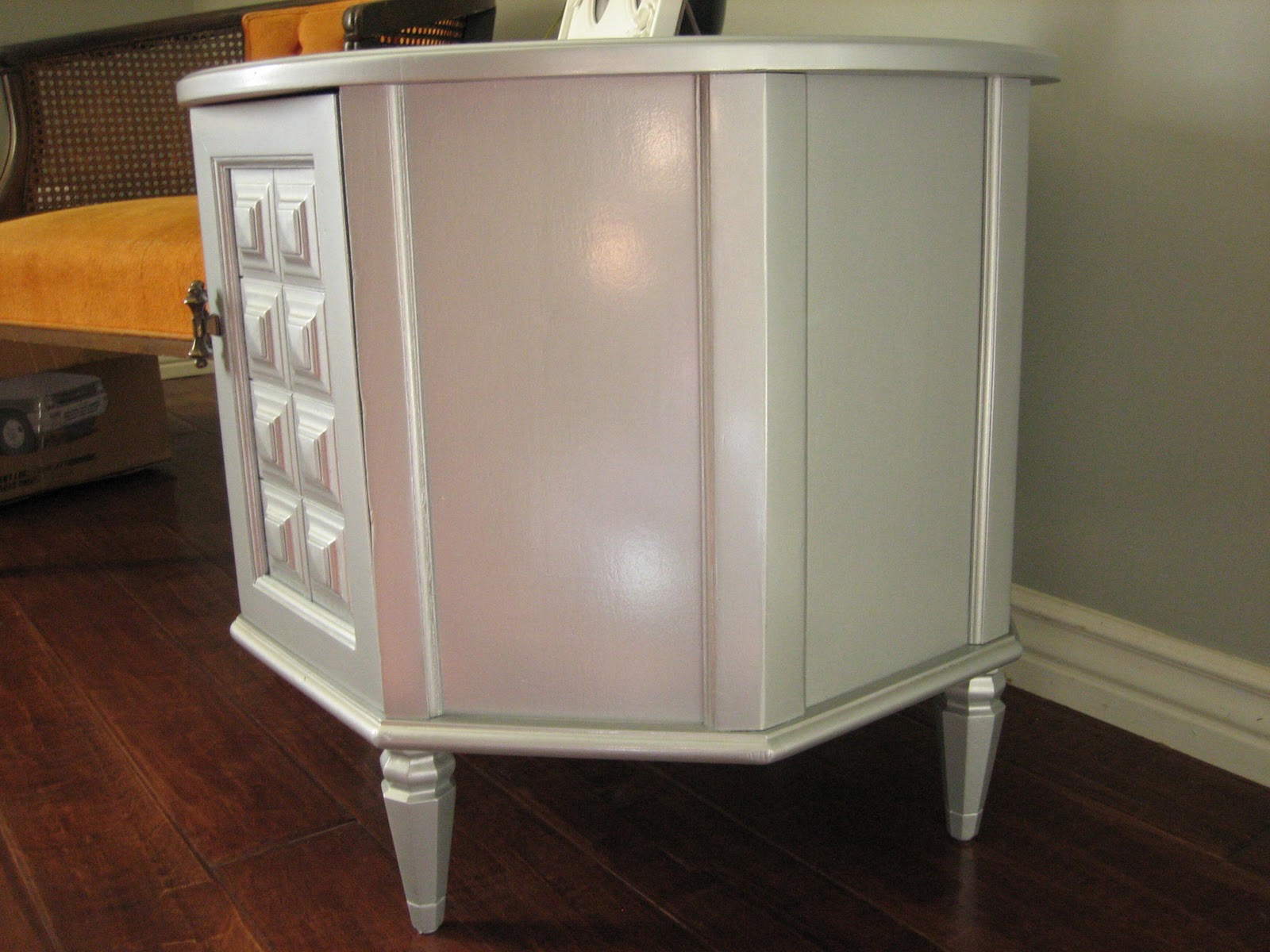 ~ SOLD ~ Vintage console in a sleek, lacquered, light clay gray finish with rich brown stained slider cabinet. Solid wood. Long slender legs...