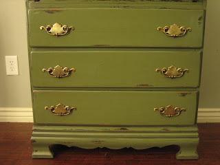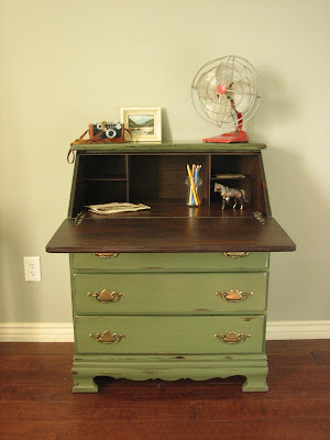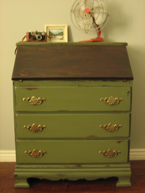 Cool vintage dresser in a smooth army green finish with a rich dark brown stain on drop down secretary desk and insides. Three drawers. Solid wood. Distressed. Nice vintage brass hardware.