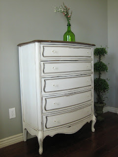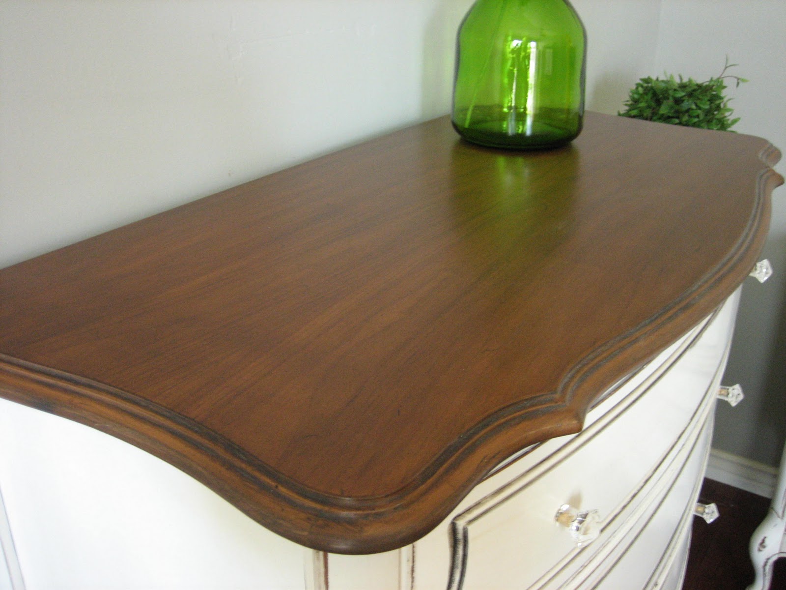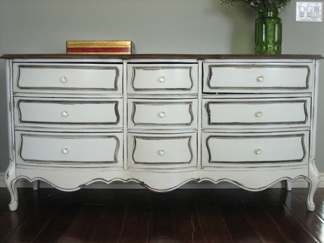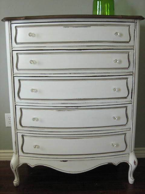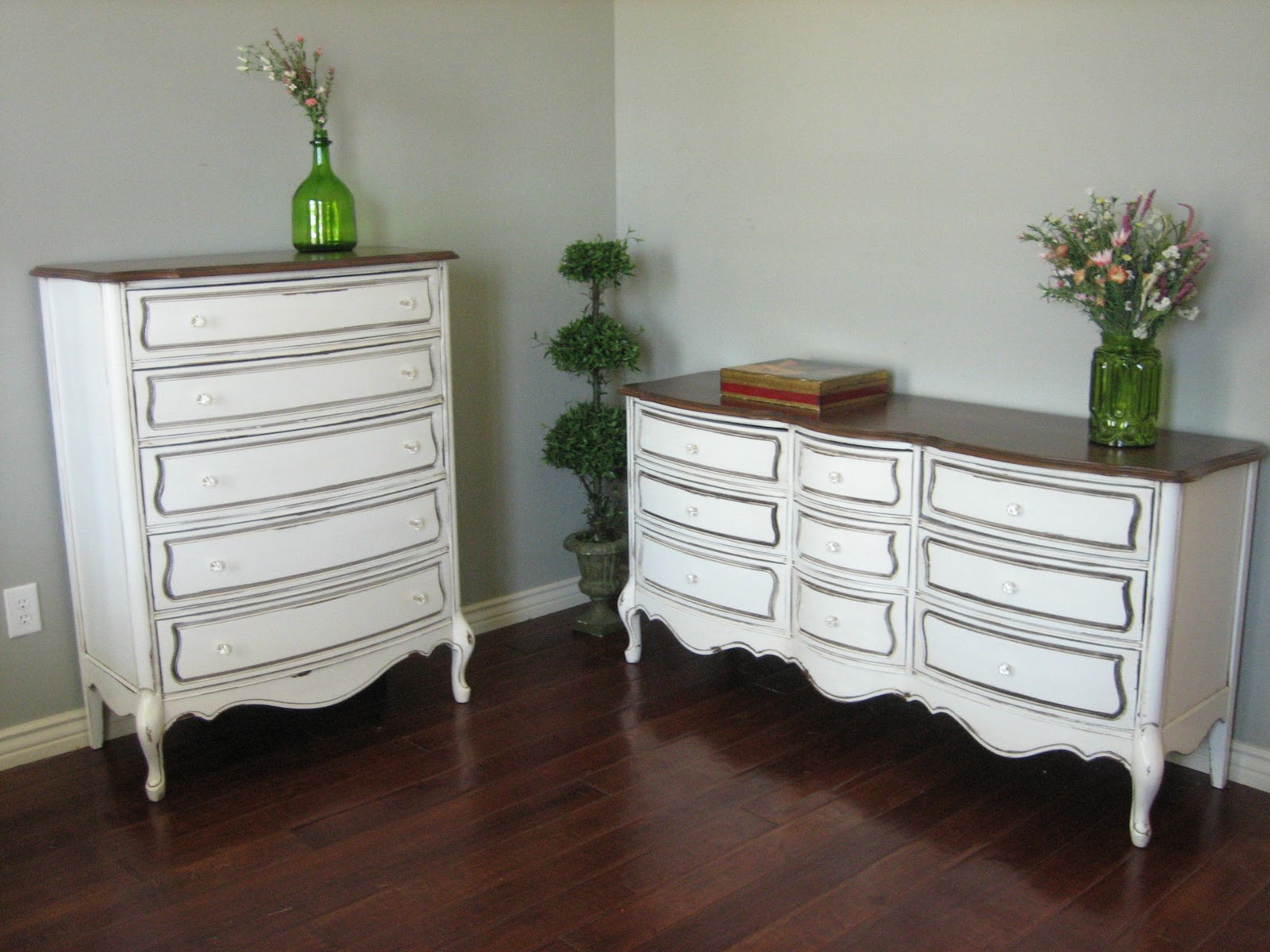 Solid wood dressers in a smooth antiqued creamy white distressed finish with a heavy glaze in the nooks and crannies. Rich, dark stained rustic tops. Pretty dove tailed, bowed drawers with decorative glass knobs.