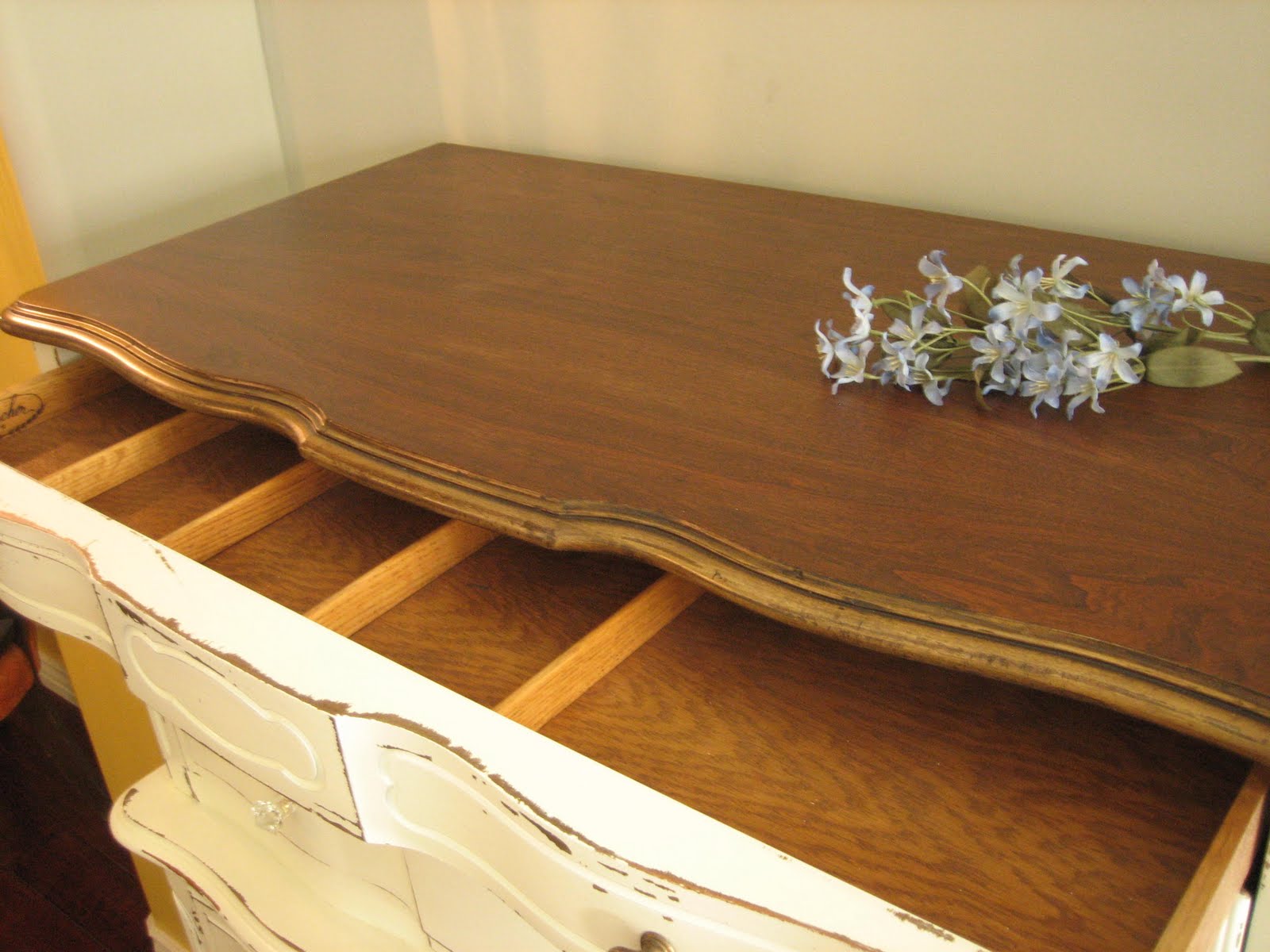 Quality 100% solid wood dressers in a smooth creamy white with a chippy distressed finish. Dove tailed drawers with decorative glass knobs. Pretty stained tops.