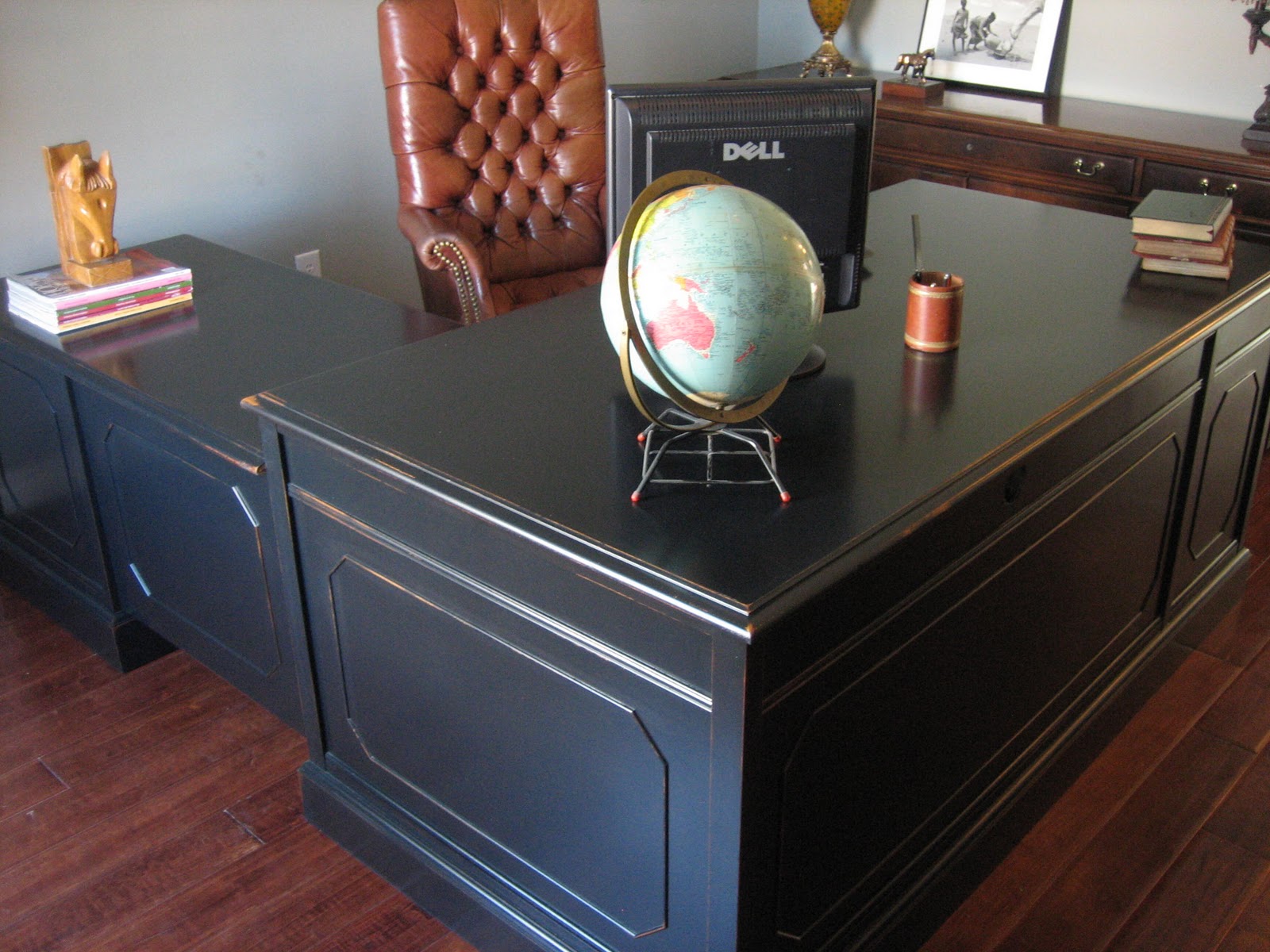 Executive office desk w/ return. Sleek black with a light rub through distressed finish. On the desk side has pencil drawer with wooden divided slots. Slide out writing tray - file drawer and 2 regular sized drawers. On return side has deep legal filing drawer and regular size drawers. All drawers are dove tailed and are on ball bearing slides that work smoothly. Nice hardware. Drawers on desk side have security feature that lock up when pencil drawer is fully closed & open when pencil drawer is slightly open.