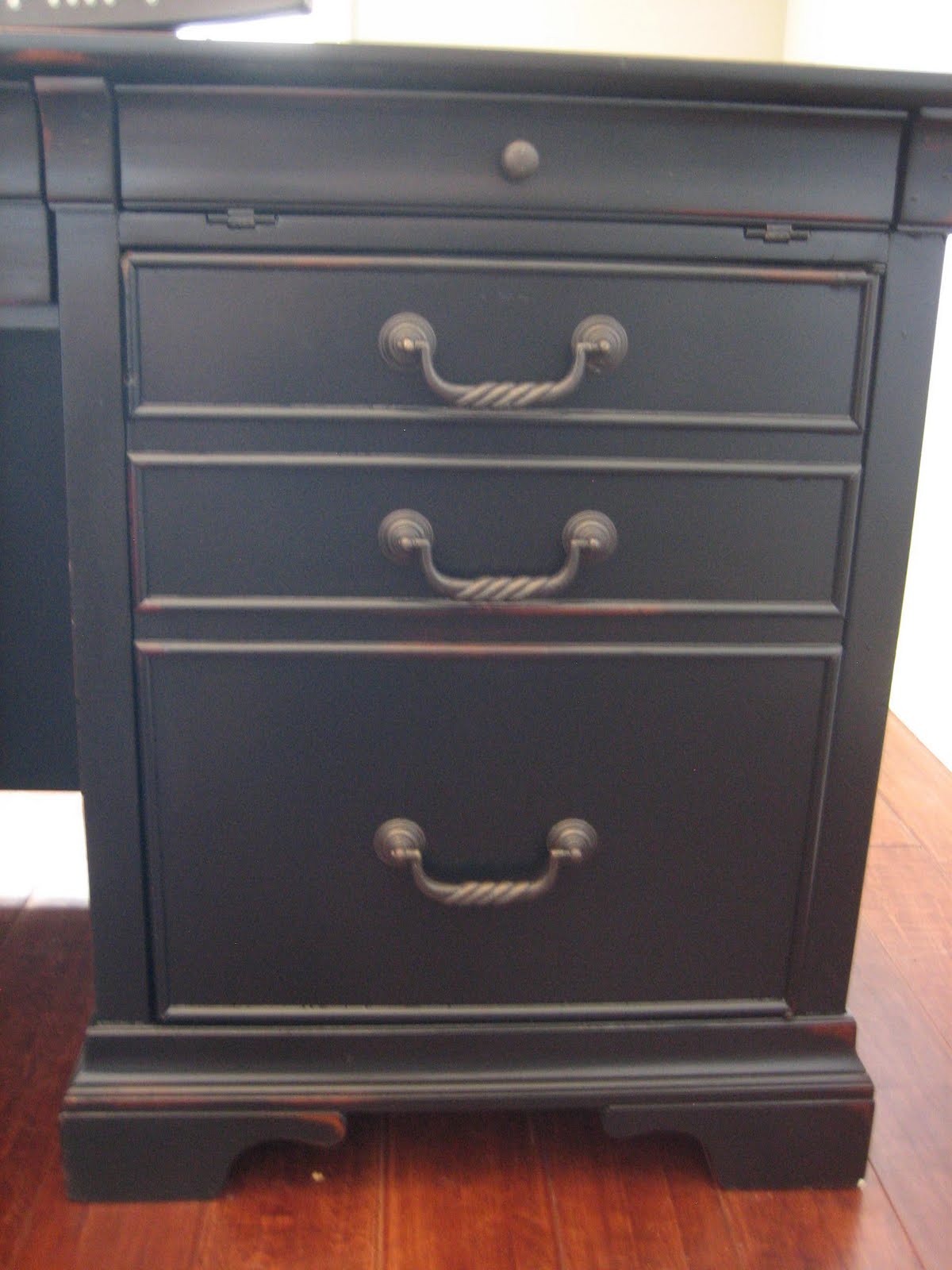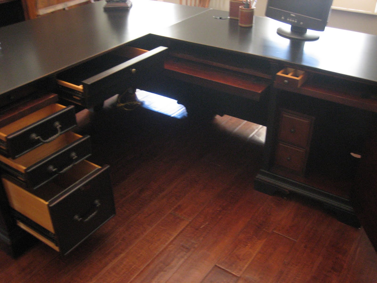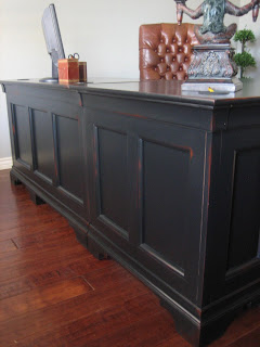 Large wood Razmataz executive office desk w/ return. Raised panels. Sleek black with a light weathered rub through distressed finish.