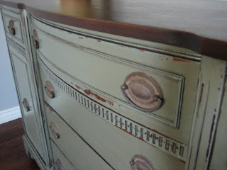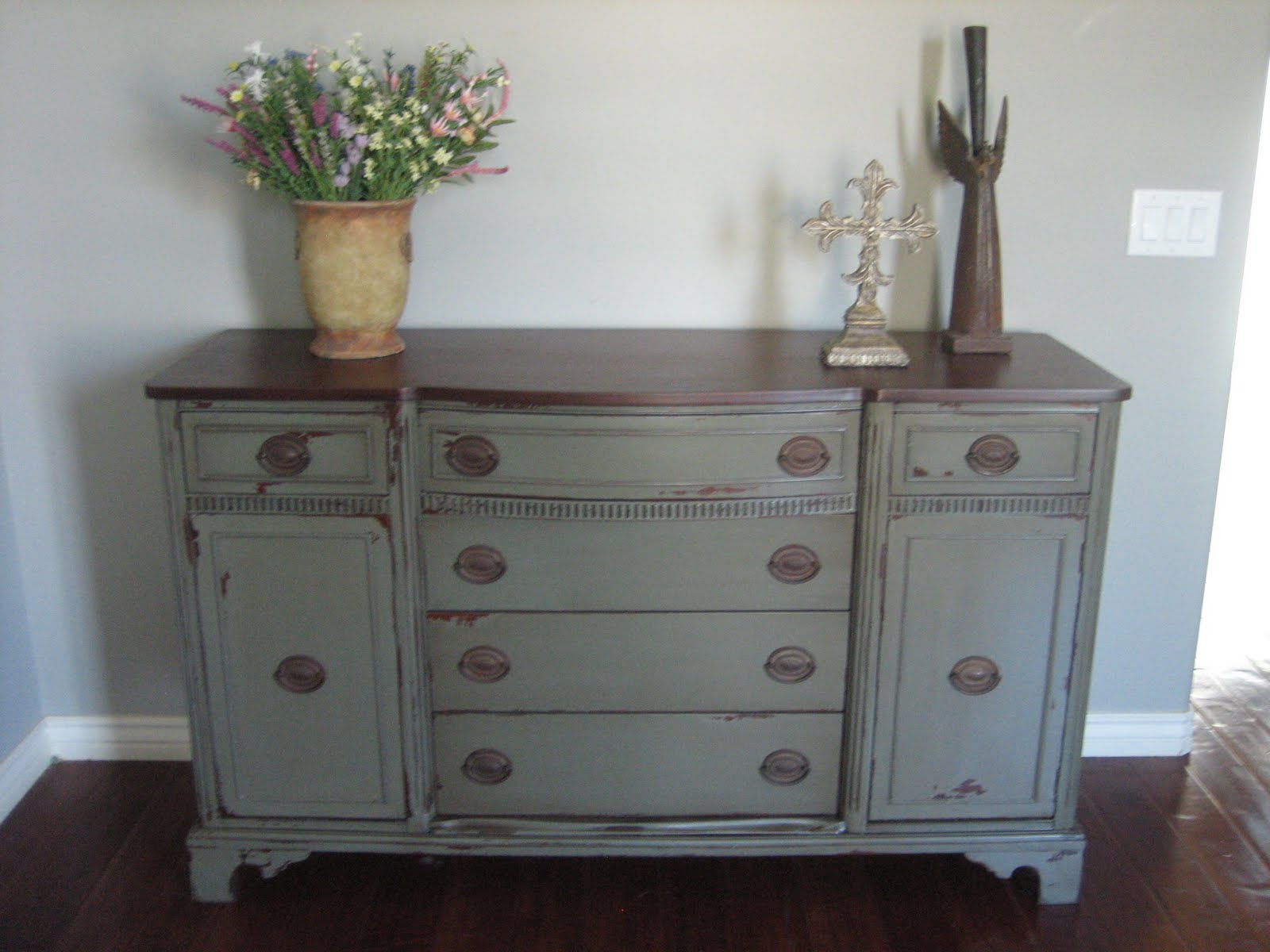 Beautiful wood buffet in a dark greenish gray distressed and glazed finish. Stained top. Original hardware pulls. Six dove tail drawers. Top middle drawer is bowed with a wooden slat divider. Two cabinets- each with a shelf. Lots of storage.