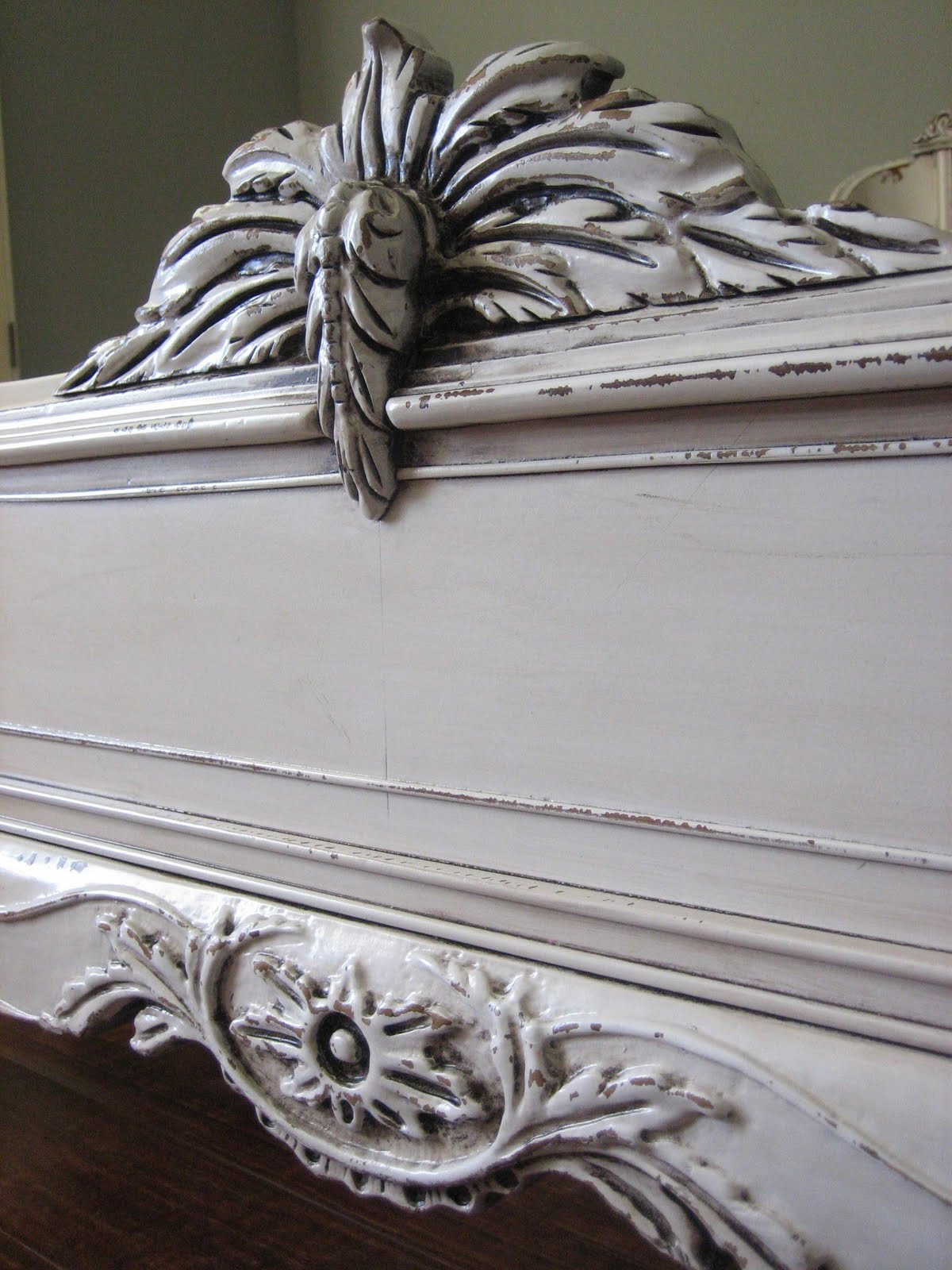 Beautiful Victorian French bedroom set that consists of a full size bed, nightstand and mirror. Smooth antiqued white chippy distressed finish and heavy glaze. Very ornate and carved details. Same details and finish as two dressers previously posted.