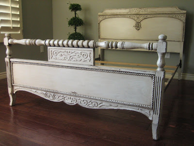 Antiqued ivory white in a chippy, weathered distressed finish with a heavy glaze. Thick braided rope trim work and ornate carved details.
