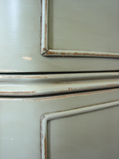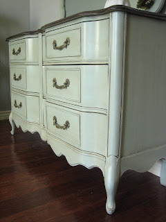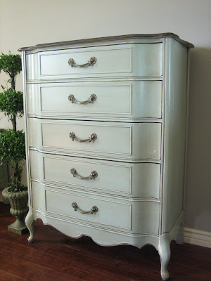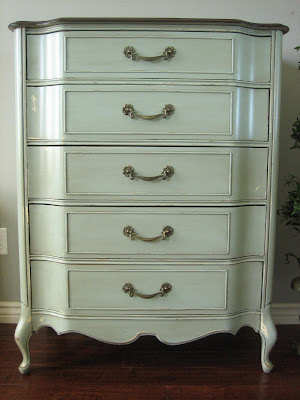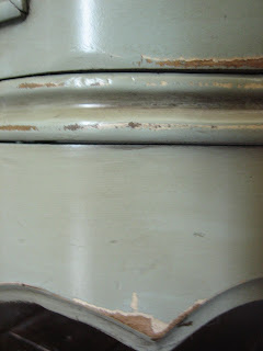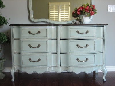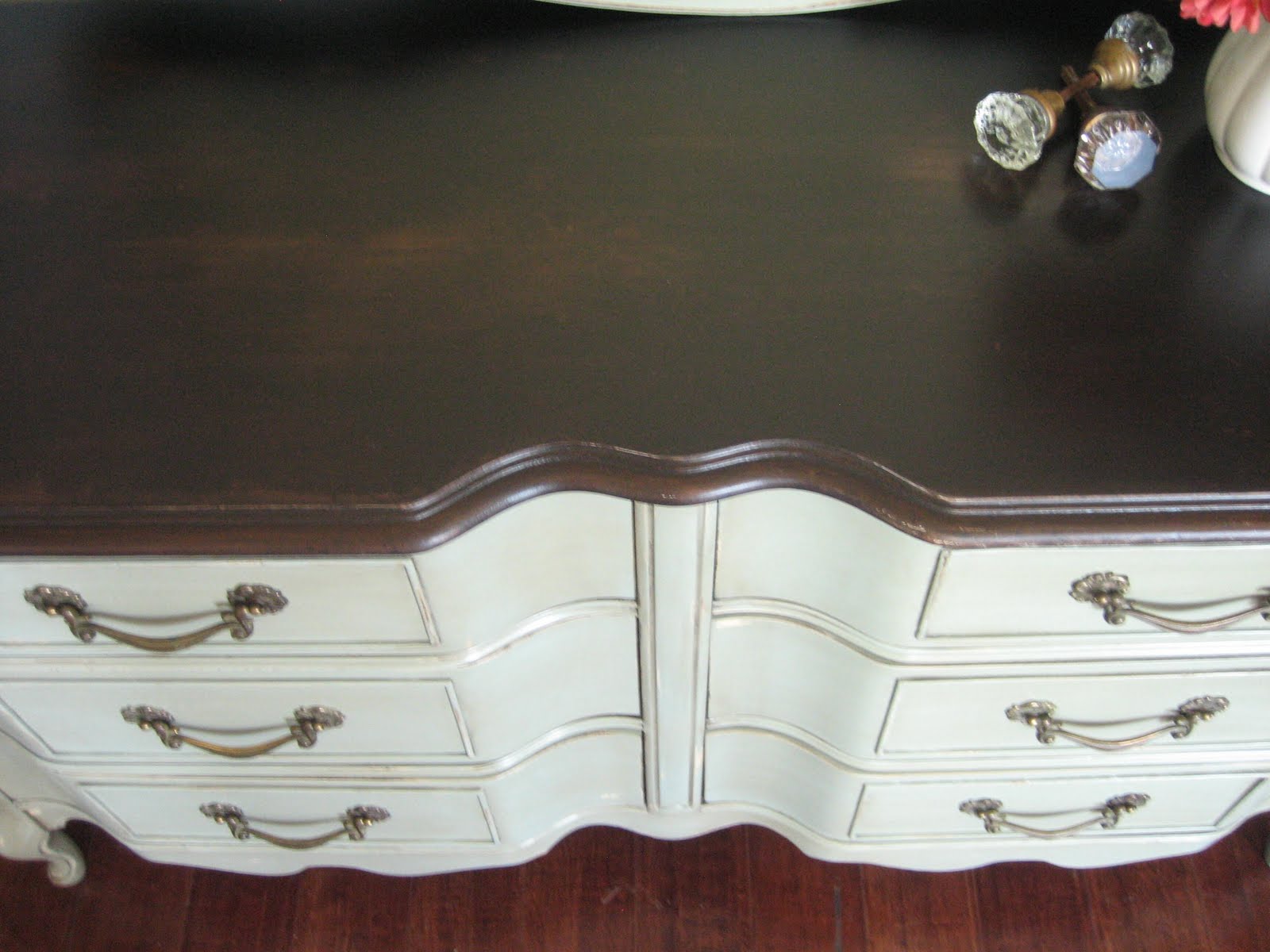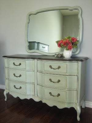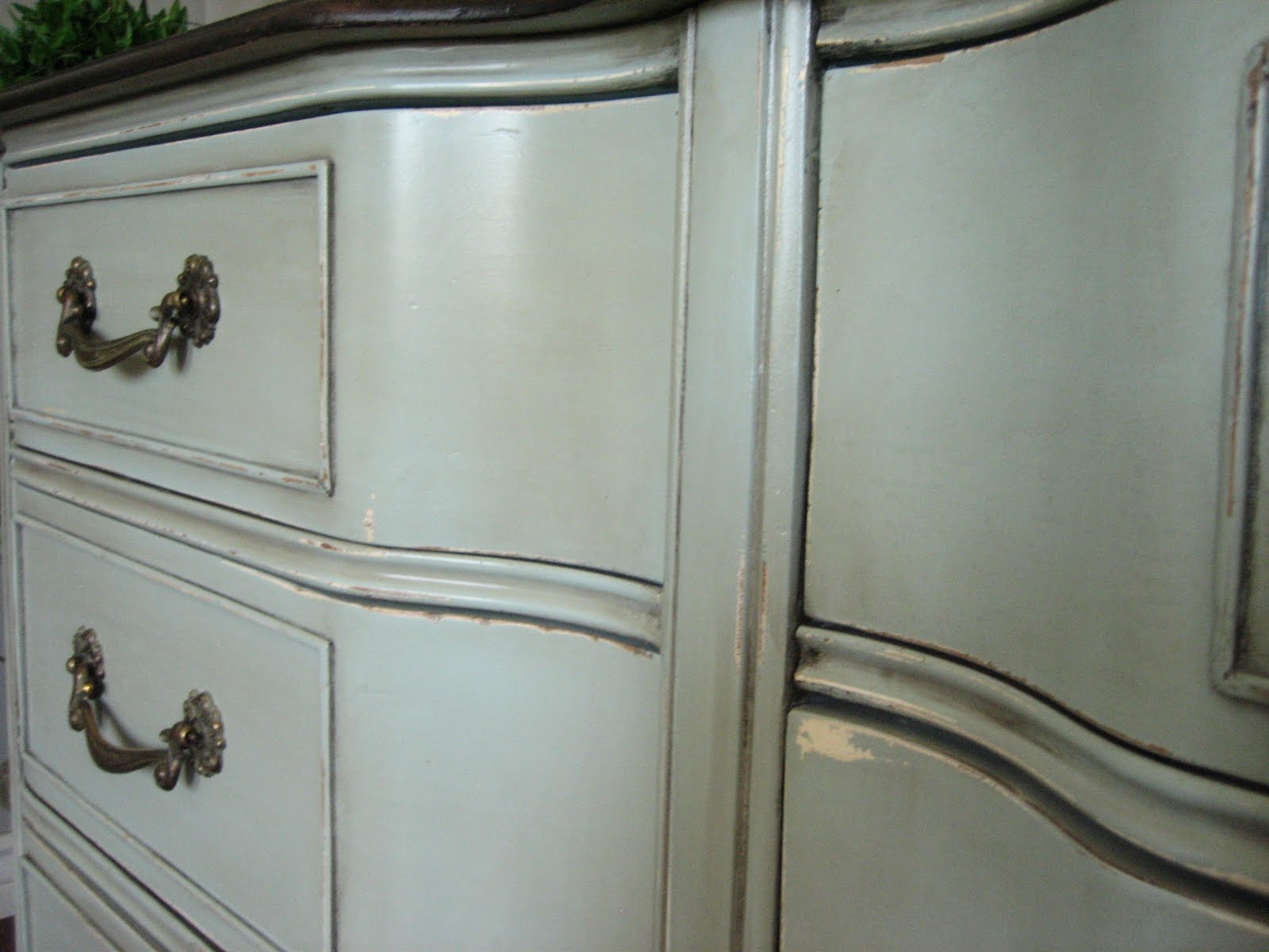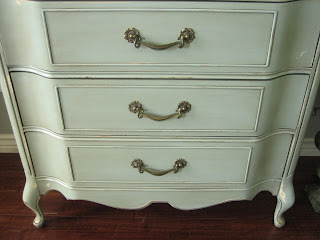 Charming and elegant, solid wood set in a smooth french cottage gray green color, lightly distressed and creamy glazed finish. Stained tops. Dovetailed drawers with raised trim work. Pretty pulls. Nice bowed and scalloped bottoms.