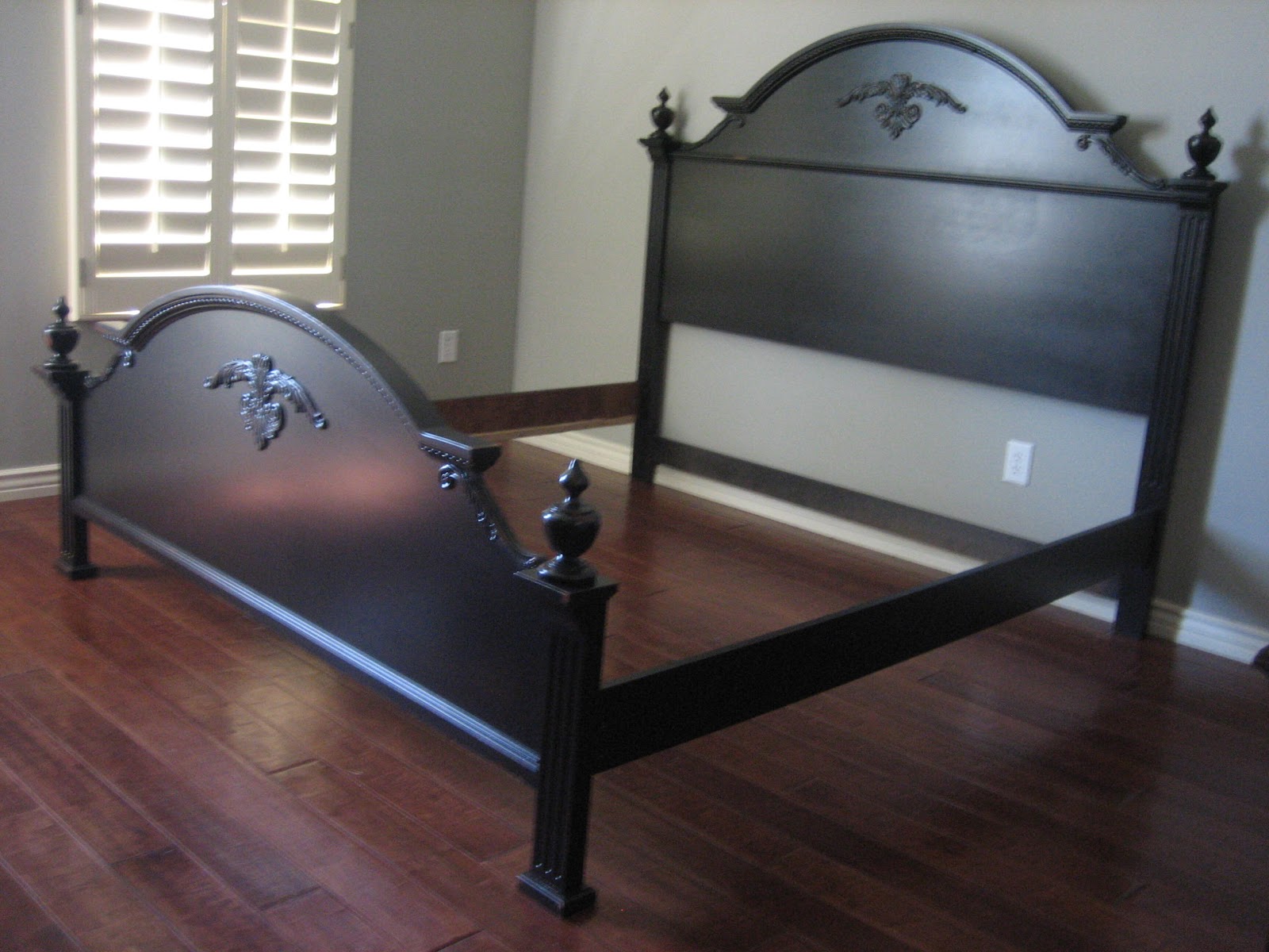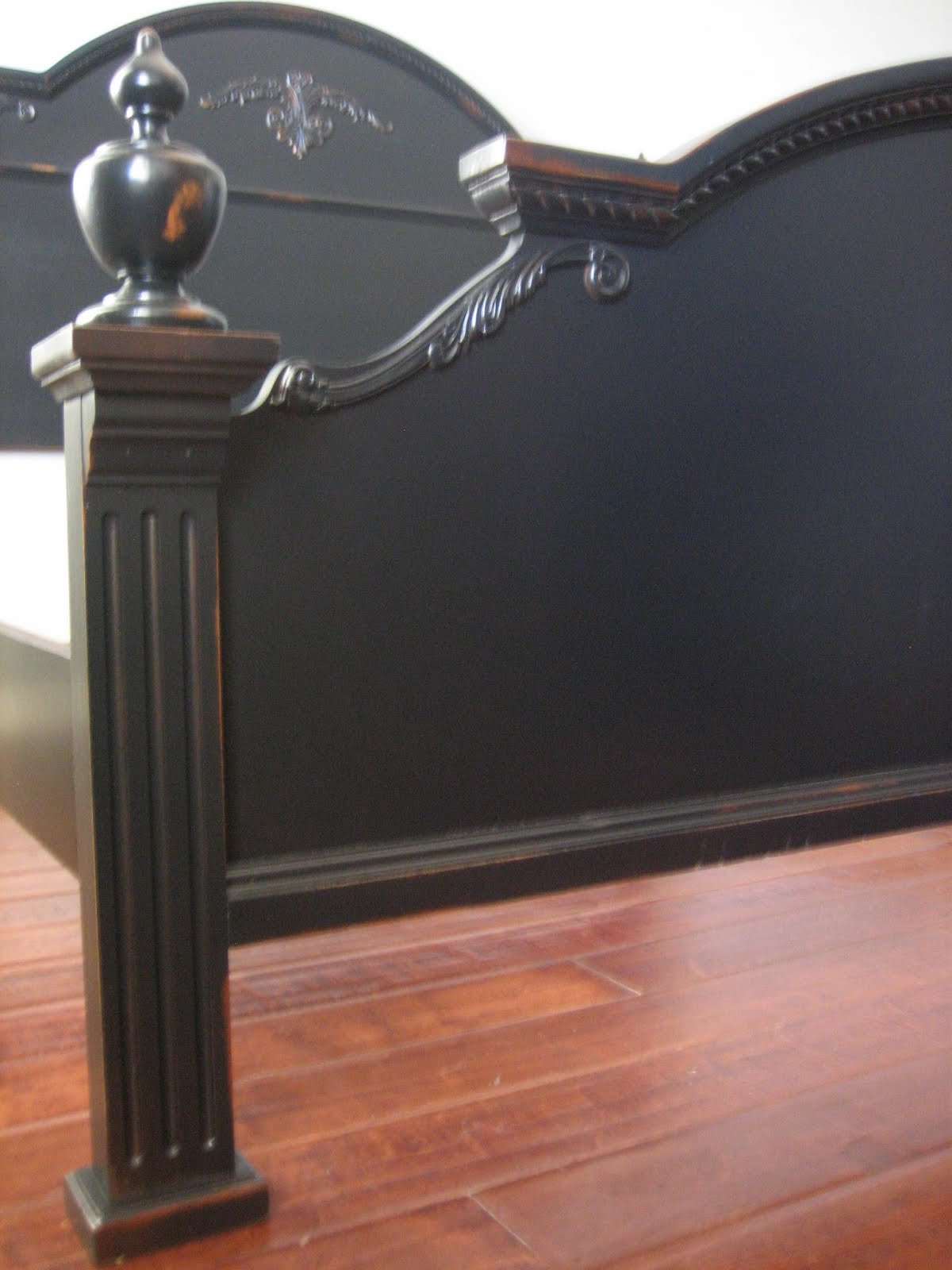 Large king size bed with Old World charm. Black with a light rub through distressed finish. Pretty carved details on headboard and foot board with thick braided rope trim. Large finials atop the four posts. A must see in person.
