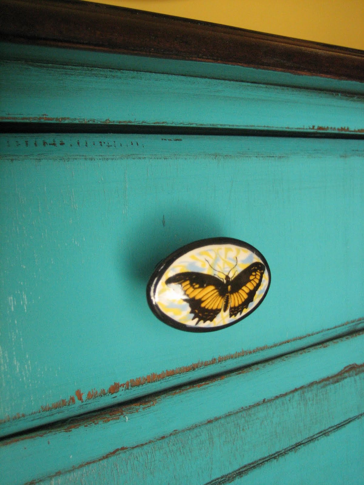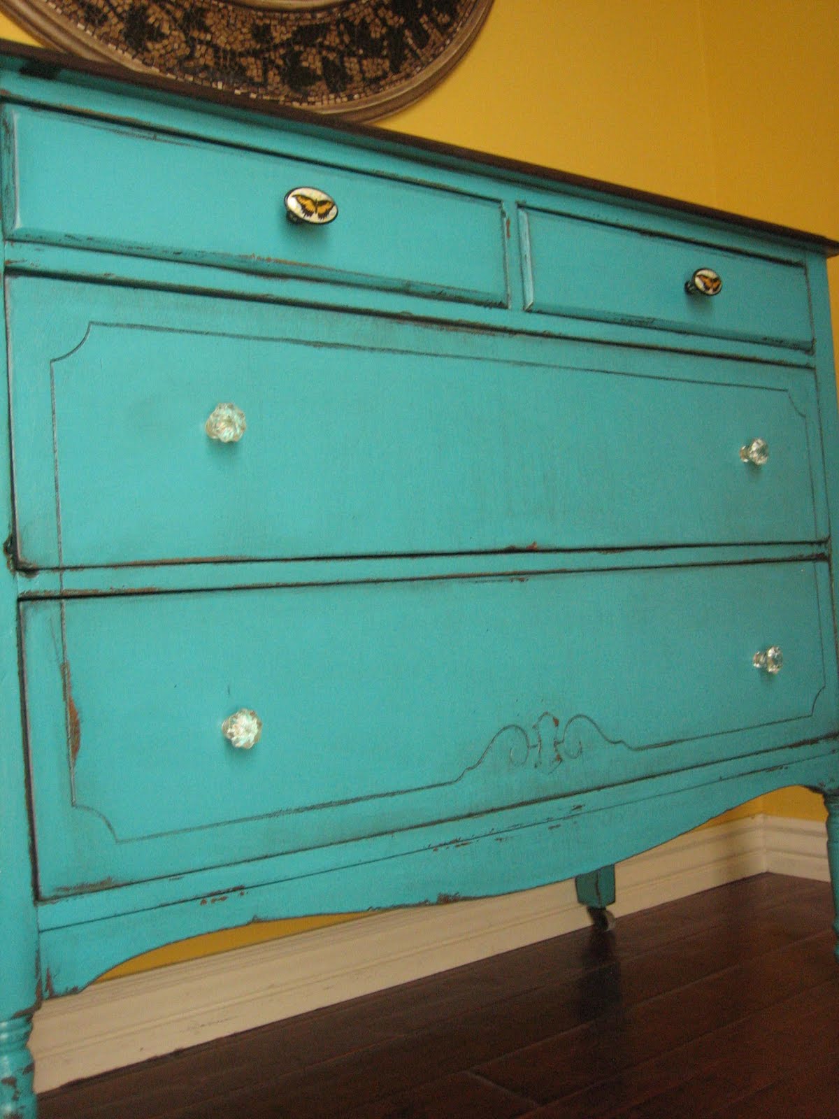 Antique dresser in a striking and bold teal finish, lightly distressed and glazed. Stained top. Rustic piece with character. Stands on caster's. Pretty decorative butterfly knobs on top two drawers and glass knobs on bottom two drawers. Drawers are dovetailed.