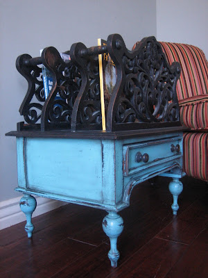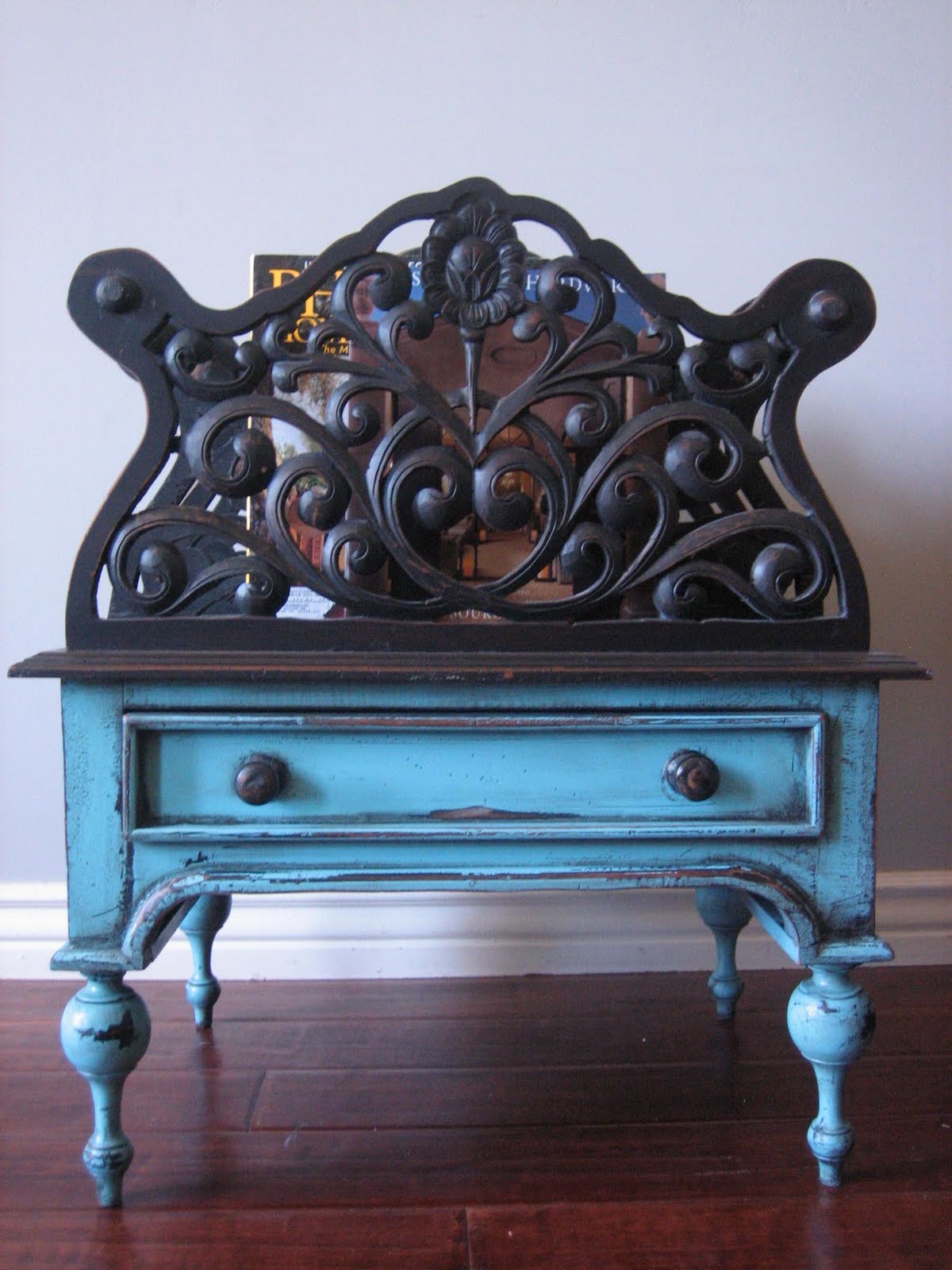Unique magazine holder by Marie Albert French and Country Furniture, New York from Neiman Marcus. Turquoise/aqua blue weathered and distressed finish with an ornate carved wood top. Stands on turned legs with a single drawer for storage. The back does have a small piece of wood missing on the rack, about 1". Does not effect the piece.