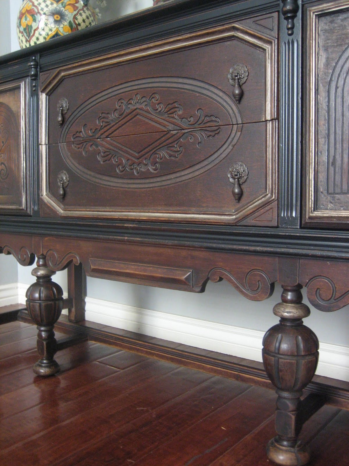 Old World antique sideboard in a two-toned rustic stain and black distressed finish, accented with metallic gold. Stands on turned feet. Beautiful carved details throughout. Two cabinets and two drawers with original teardrop hardware.