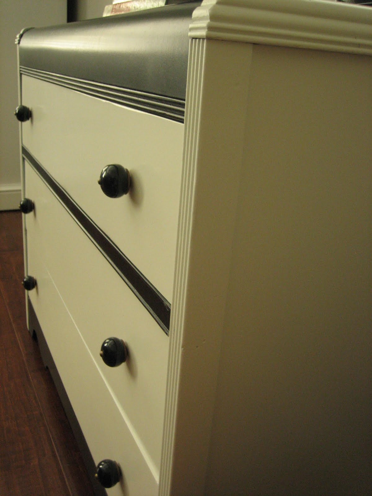 Mid-century vintage 1940's wood waterfall dresser with mirror. Black and ivory white with black ceramic decorative knobs.