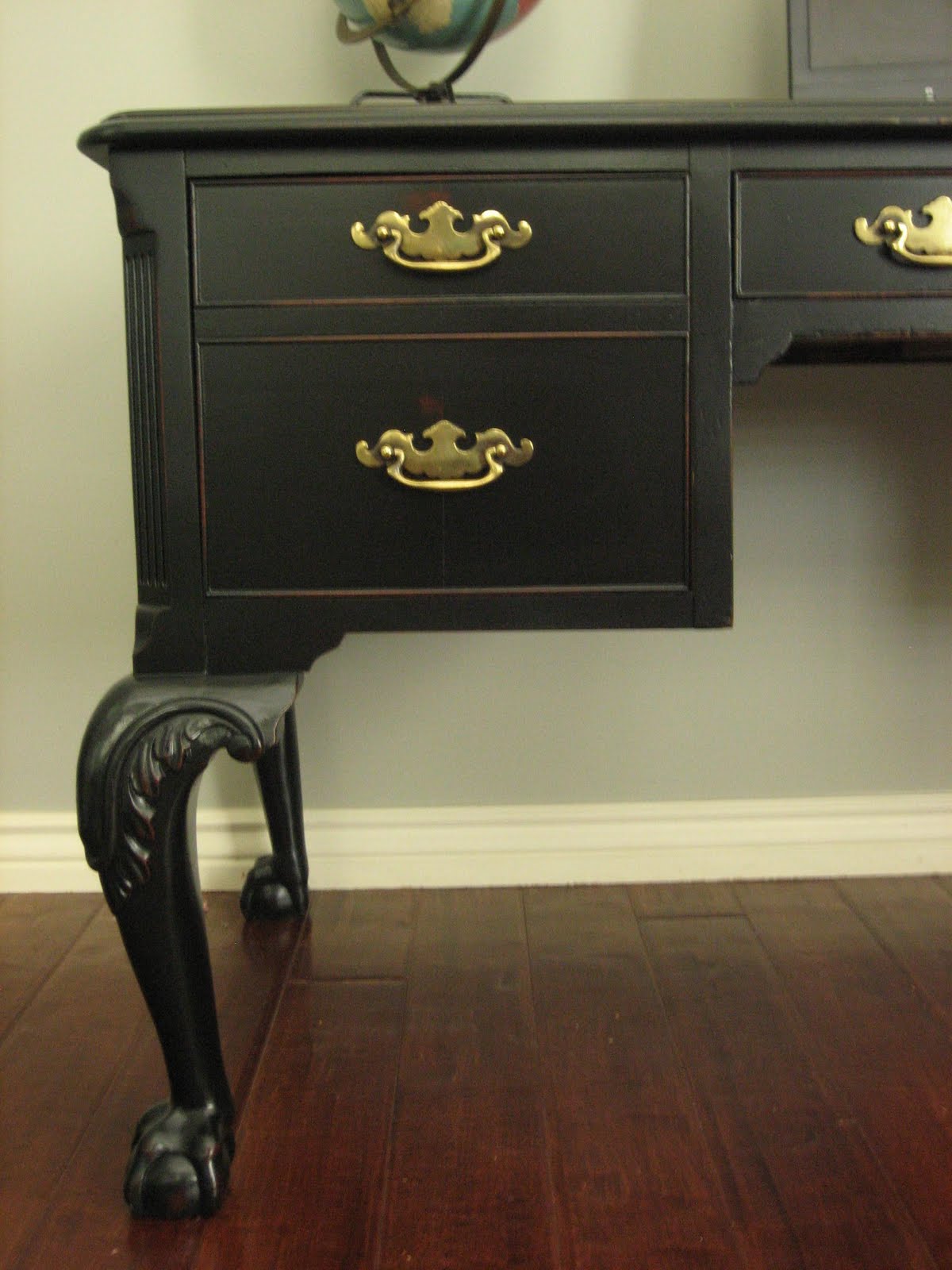 Large quality home/office executive desk. Black rub through distress finish. Carved cabriolet leg with claw on ball foot. Fluted chamfered corners. Dark brown leather top with gold leaf design. Four drawers, one of which is a deep file drawer on metal slides. Push up against wall or center in room - back is finished. A very pretty, elegant desk.
