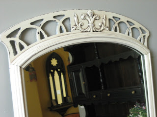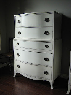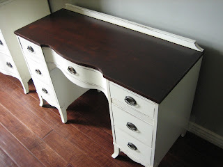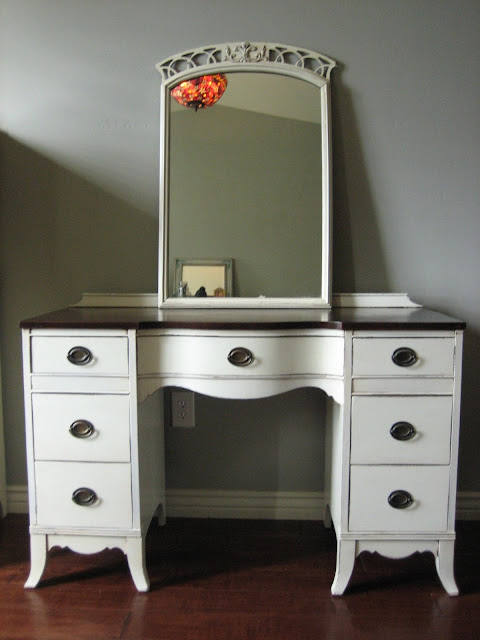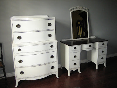 Pretty dresser in a smooth antique creamy white finish. Has a light chippy distress around the edges and is glazed. Dresser is a nice size stacked chest with good sized dove-tailed drawers. Five drawers that are bowed in the middle. The vanity is in the same finish with a dark brown stained top and a cute mirror with decorative carving that sits on top. Can add a wire to the back to hang on wall. Middle drawer is bowed like the dresser drawers. Has 6 more drawers, three on each side.