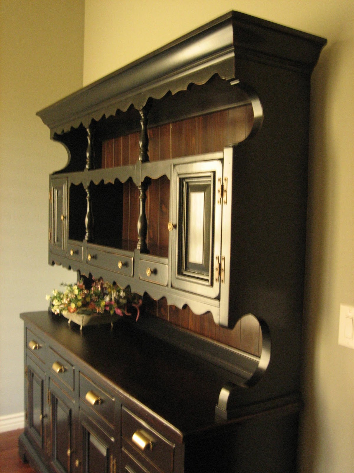 Beautiful black hutch with a light rub through distressed finish. Rustic stained top and bead board backing. Antiqued brass bin pulls and knobs. Raised panel cabinets. Cute support posts and scalloped detailing. Loads of storage. Four bottom cabinets open to one large storage area with shelf inside. Two cabinets and three drawers on upper hutch.