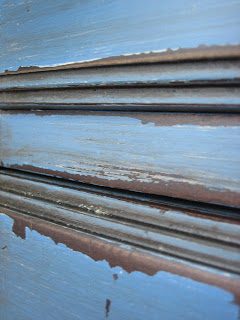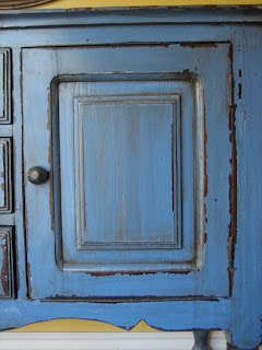 Rustic buffet in a blue, heavily glazed and chippy distressed finish. Has three dove-tailed drawers with oil rubbed bronze bin pulls and two raised panel cabinets with hammered knobs. Solid wood.