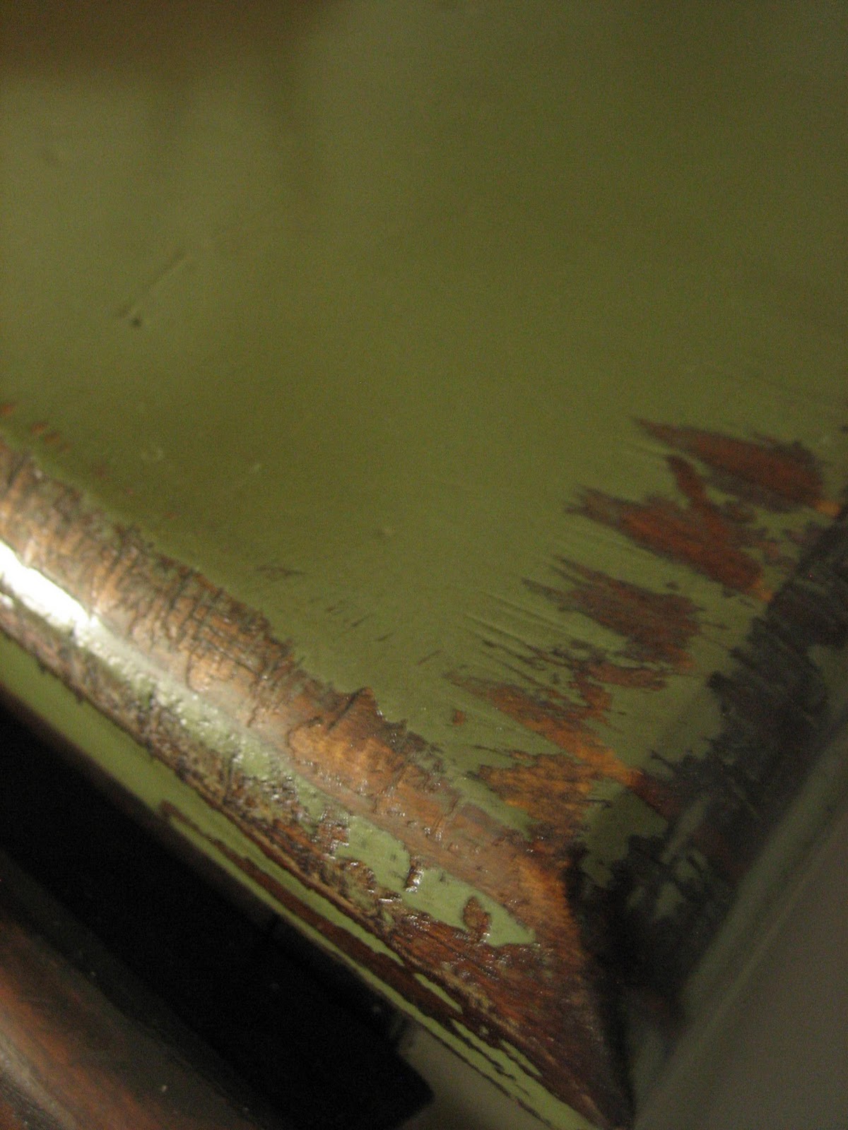 Cool vintage dresser in a smooth army green finish with a rich dark brown stain on drop down secretary desk and insides. Three drawers. Solid wood. Distressed. Nice vintage brass hardware.