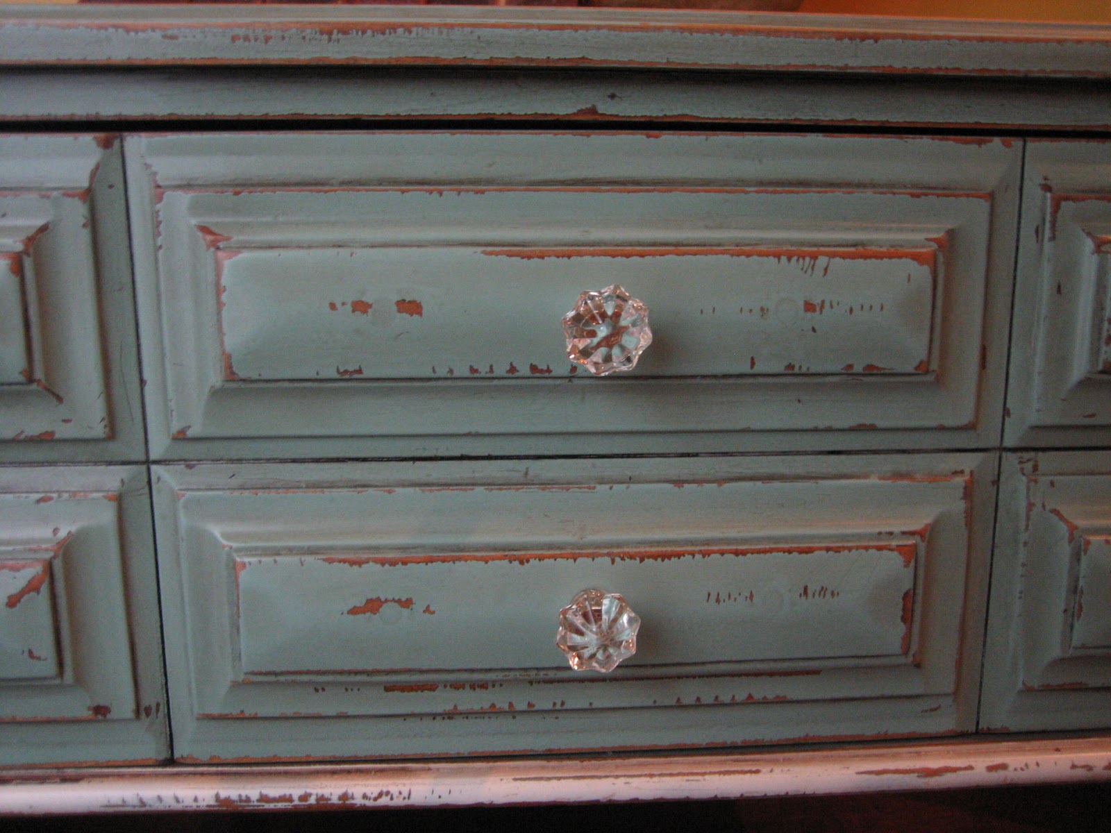 French cottage green chippy distressed and glazed finish with a creamy white strip along the bottom edge. Two glass knobs on single deep drawer.