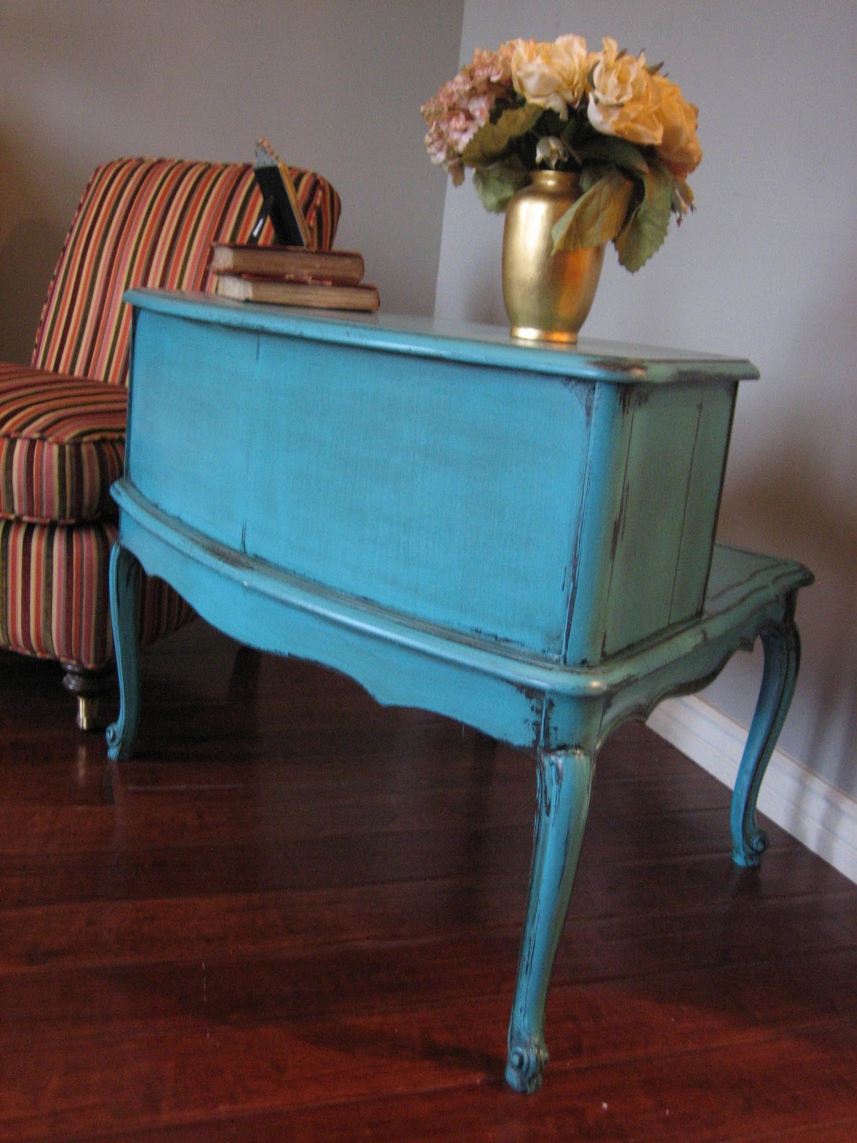 Two tiered end table in a striking and bold turquoise teal chippy distressed finish. Two cabinets with brass wire. Two drawers. Stands on pretty legs.