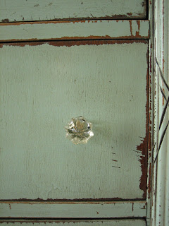Charming antique dresser in a cottage green with a chippy weathered distressed finish. Primitive rustic stained top with gold etching on scalloped back. Stands on pretty legs with caster's. Detailed carved molding going down the sides. Glass knobs. Four drawers.