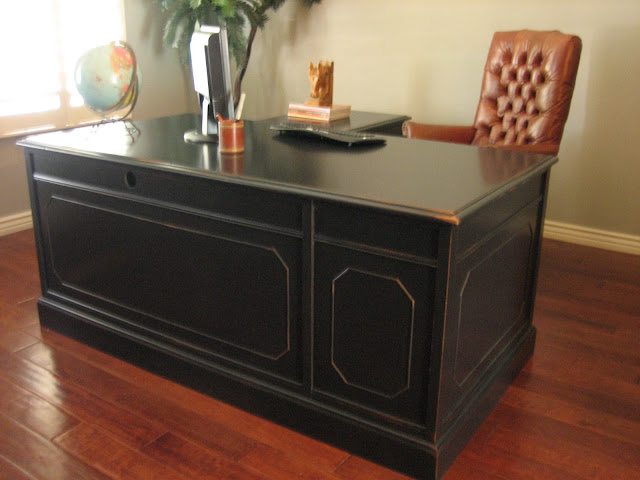 Executive office desk w/ return. Sleek black with a light rub through distressed finish. On the desk side has pencil drawer with wooden divided slots. Slide out writing tray - file drawer and 2 regular sized drawers. On return side has deep legal filing drawer and regular size drawers. All drawers are dove tailed and are on ball bearing slides that work smoothly. Nice hardware. Drawers on desk side have security feature that lock up when pencil drawer is fully closed & open when pencil drawer is slightly open.